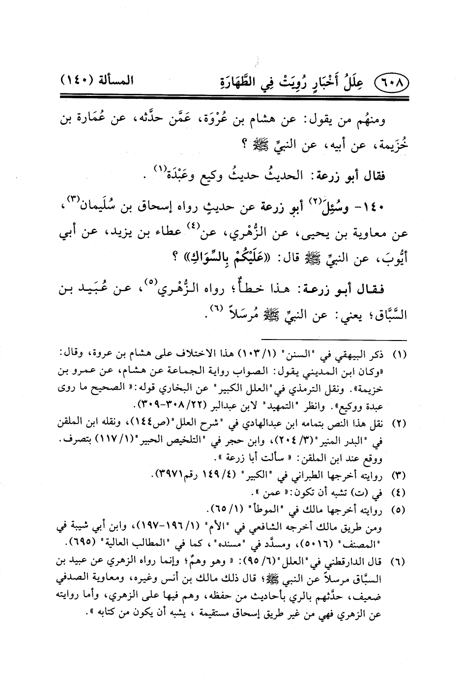 ١٤٠- وسُئِلَ (٢) أَبُو زُرْعَةَ عَنْ حديثٍ رَوَاهُ إِسْحَاقُ بْنُ سُلَيمان (٣) ، عَنْ مُعَاوِيَةَ بْنِ يَحْيَى، عَنِ الزُّهْري، عَنْ (٤) عَطَاءِ بْنِ يَزِيدَ، عَنْ أَبِي أيُّوبَ، عَنِ النبيِّ (ص) قَالَ: عَلَيْكُمْ بِالسِّوَاكِ؟