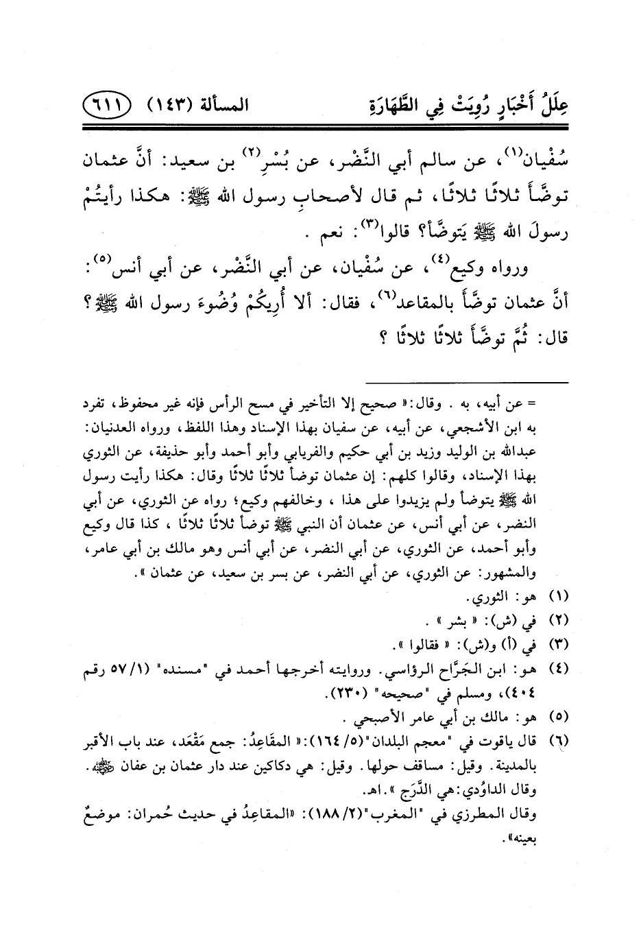 سُفْيان (١) ، عَن سالم أَبِي النَّضْر، عَن بُسْرِ (٢) بْن سَعِيد: أنَّ عُثْمَان توضَّأَ ثلاثًا ثلاثًا، ثُمَّ قال لأصحابِ رسول الله (ص) : هكذا رأيتُمْ رسولَ الله (ص) يَتوضَّأ؟ قالوا (٣) : نعم.