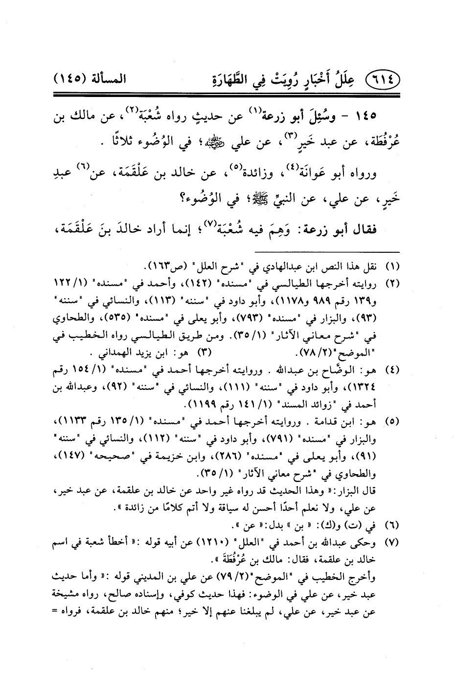 ١٤٥ - وسُئِلَ أَبُو زُرْعَةَ (١) عَنْ حديثٍ رَوَاهُ شُعْبَة (٢) ، عَنْ مَالِكِ بْنِ عُرْفُطَة، عَنْ عَبْدِ خَيرٍ (٣) ، عَن علي ح؛ فِي الوُضُوء ثلاثًا.