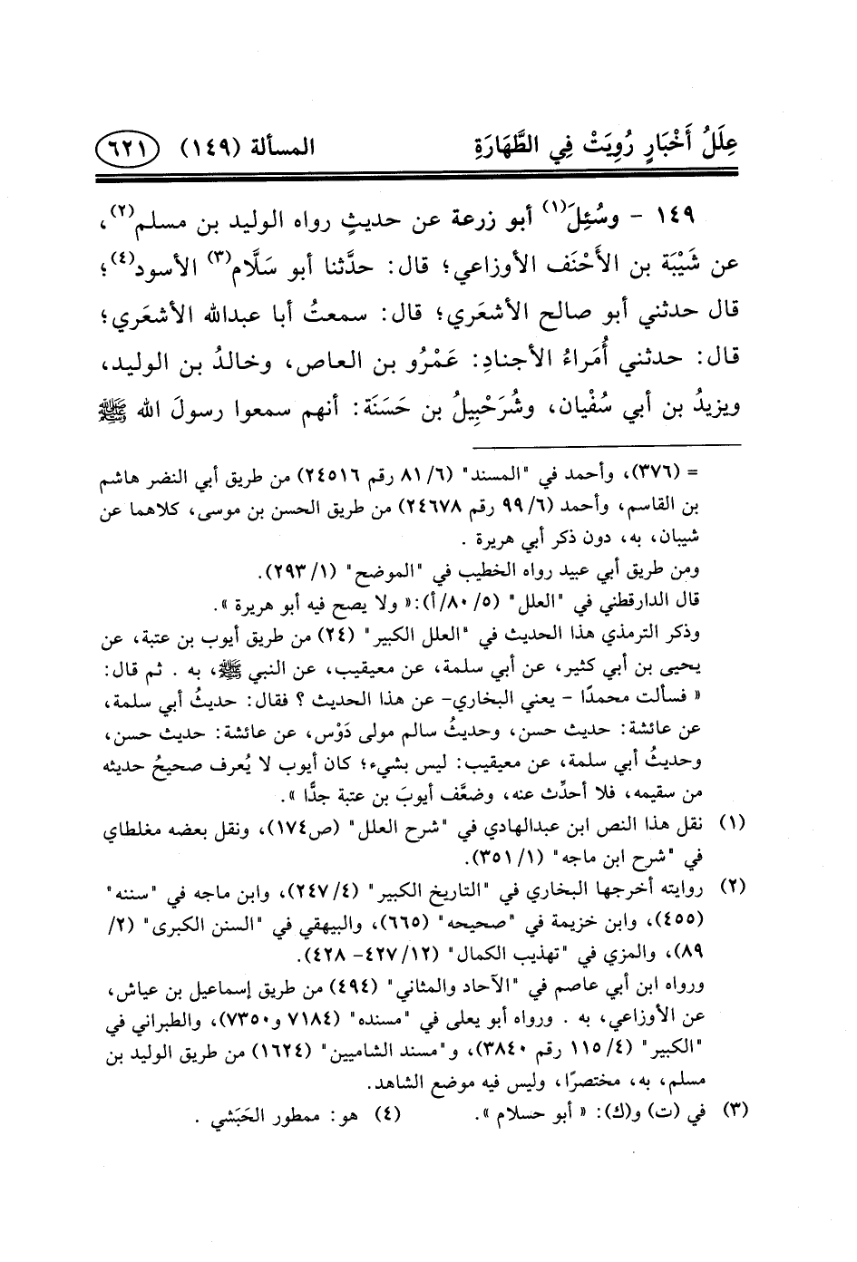 ١٤٩ - وسُئِلَ (١) أَبُو زُرْعَةَ عَنْ حديثٍ رَوَاهُ الْوَلِيدُ بْنُ مُسْلِمٍ (٢) ، عَن شَيْبَة بْنِ الأَحْنَف الأوْزَاعِيِّ؛ قَالَ: حدَّثنا أَبُو سَلَاّم (٣) الأَسْوَدُ (٤) ؛ قَالَ حَدَّثَنِي أَبُو صَالِحٍ الأشعَري؛ قَالَ: سمعتُ أبا عبد الله الأشعَري؛ قَالَ: حَدَّثَنِي أُمَراءُ الأجنادِ: عَمْرُو بْنُ الْعَاصِ، وخالدُ بْنُ الْوَلِيدِ، ويزيدُ بْنُ أَبِي سُفْيان، وشُرَحْبِيلُ بْنُ حَسَنَة: أَنَّهُمْ سَمِعُوا رسولَ الله (ص)