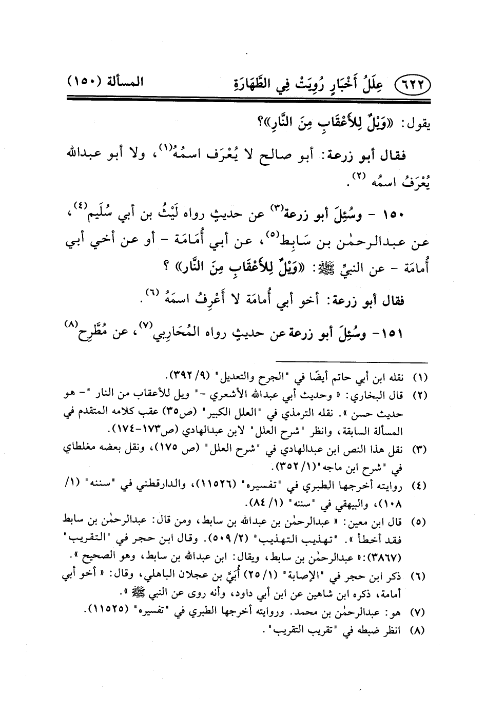 ١٥٠ - وسُئِلَ أَبُو زُرْعَةَ (٣) عَنْ حديثٍ رَوَاهُ لَيْثُ بْنُ أبي سُلَيم (٤) ، عن عبد الرحمن بْنِ سَابِط (٥) ، عَنْ أَبِي أُمَامَة - أَوْ عَنْ أَخِي أَبِي أُمامَة - عن النبيِّ (ص) : وَيْلٌ لِلأَعْقَابِ مِنَ النَّار؟