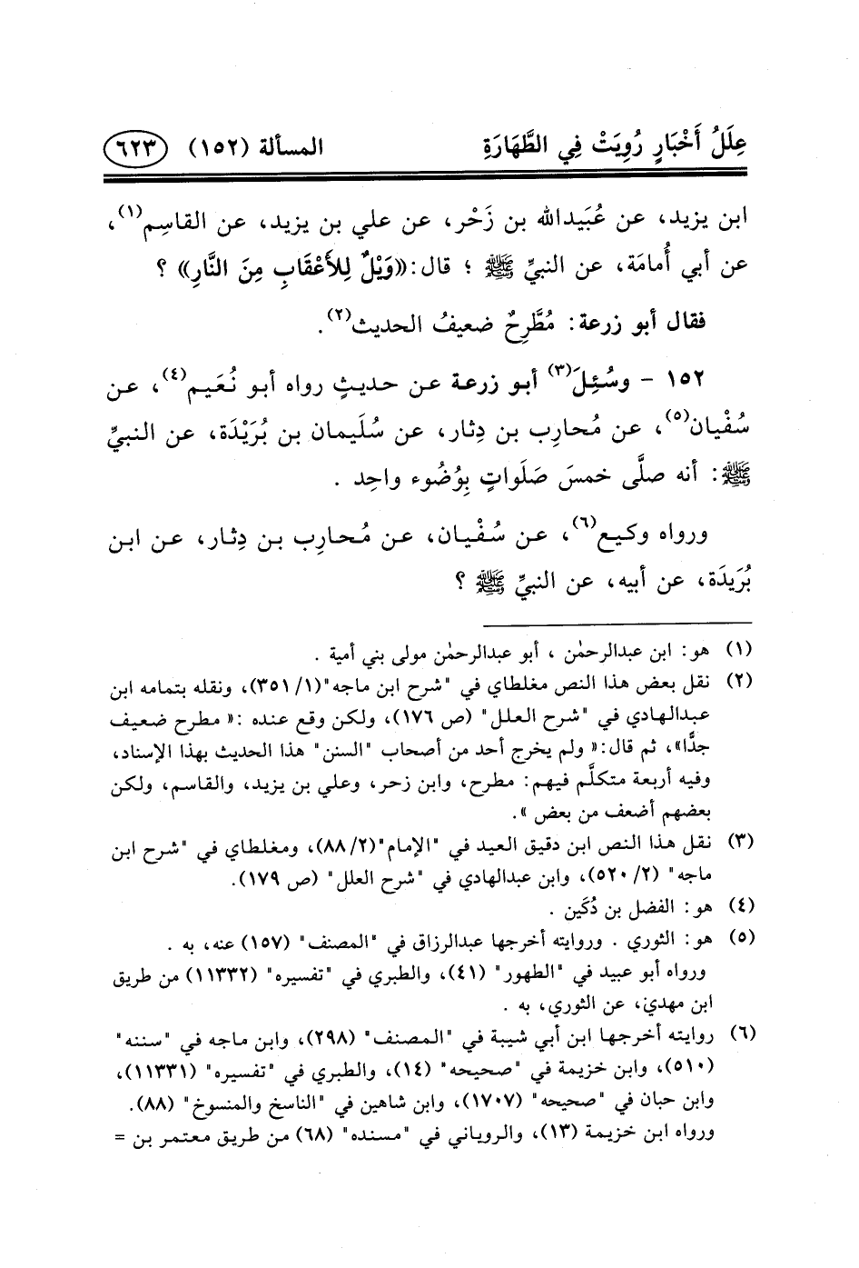 ١٥٢ - وسُئِلَ (٤) أَبُو زُرْعَةَ عَنْ حديثٍ رَوَاهُ أَبُو نُعَيم (٥) ، عَنْ سُفْيان (٦) ، عَنْ مُحارِب بْنِ دِثار، عَنْ سُلَيمان بْنِ بُرَيْدَة، عَنِ النبيِّ (ص) : أَنَّهُ صلَّى خمسَ صَلَواتٍ بِوُضُوء واحِد.