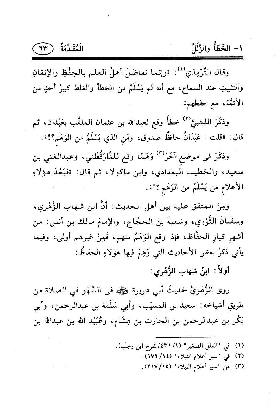ومِنَ المتفق عليه بين أهل الحديث: أنَّ ابن شهاب الزُّهْري، وسفيانَ الثَّوْري، وشعبةَ ابنَ الحجَّاج، والإمامَ مالك بن أنس: من أشهرِ كبارِ الحفَّاظ، فإذا وقع الوَهَمُ منهم، فَمِنْ غيرهم أولى، وفيما يأتي ذكرُ بعض الأحاديث التي وَهِمَ فيها هؤلاءِ الحفاظُ: