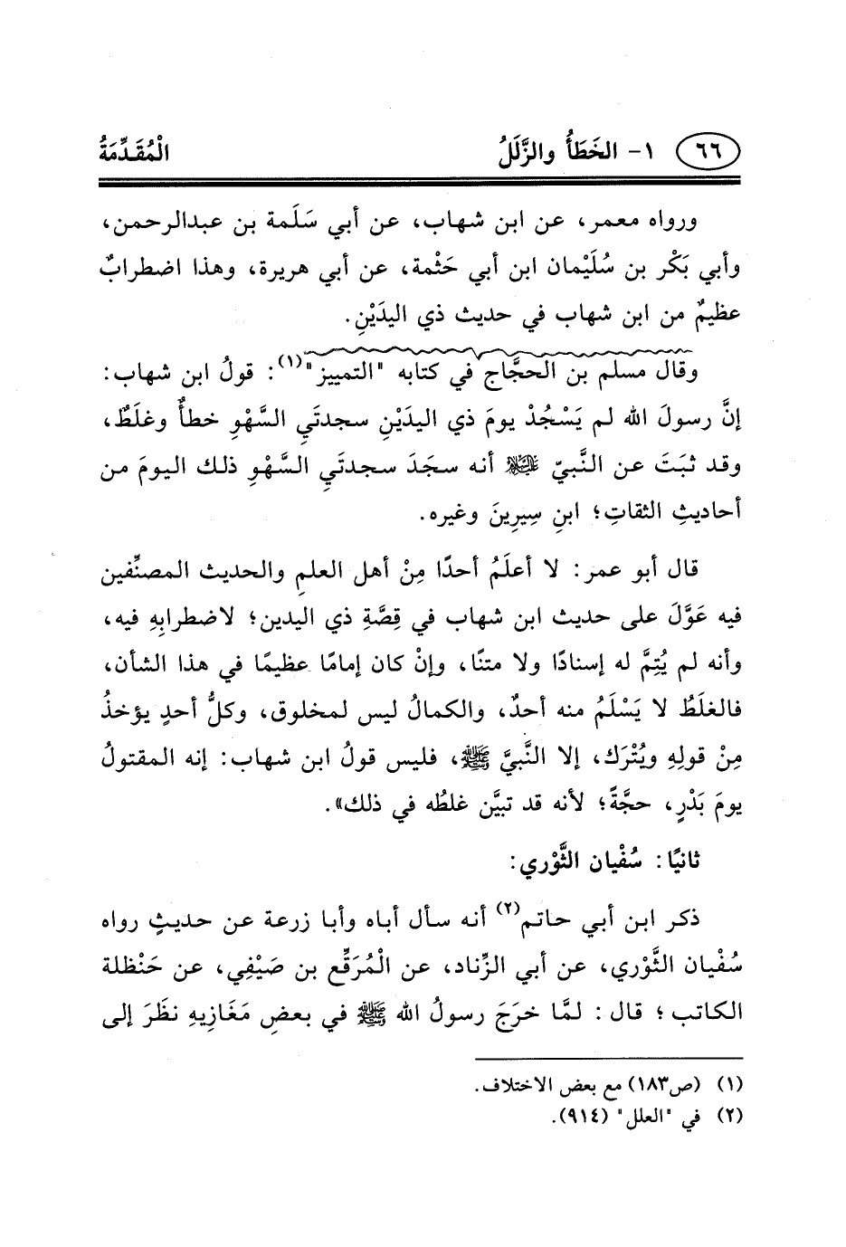 وقال مسلم بن الحجَّاج في كتابه "التمييز" (١) : قولُ ابن شهاب: إنَّ رسولَ الله لم يَسْجُدْ يومَ ذي اليدَيْنِ سجدتَيِ السَّهْوِ خطأٌ وغلَطٌ، وقد ثبَتَ عن النَّبيّ _ج أنه سجَدَ سجدتَيِ السَّهْوِ ذلك اليومَ من أحاديثِ الثقاتِ؛ ابنِ سِيرِينَ وغيره.