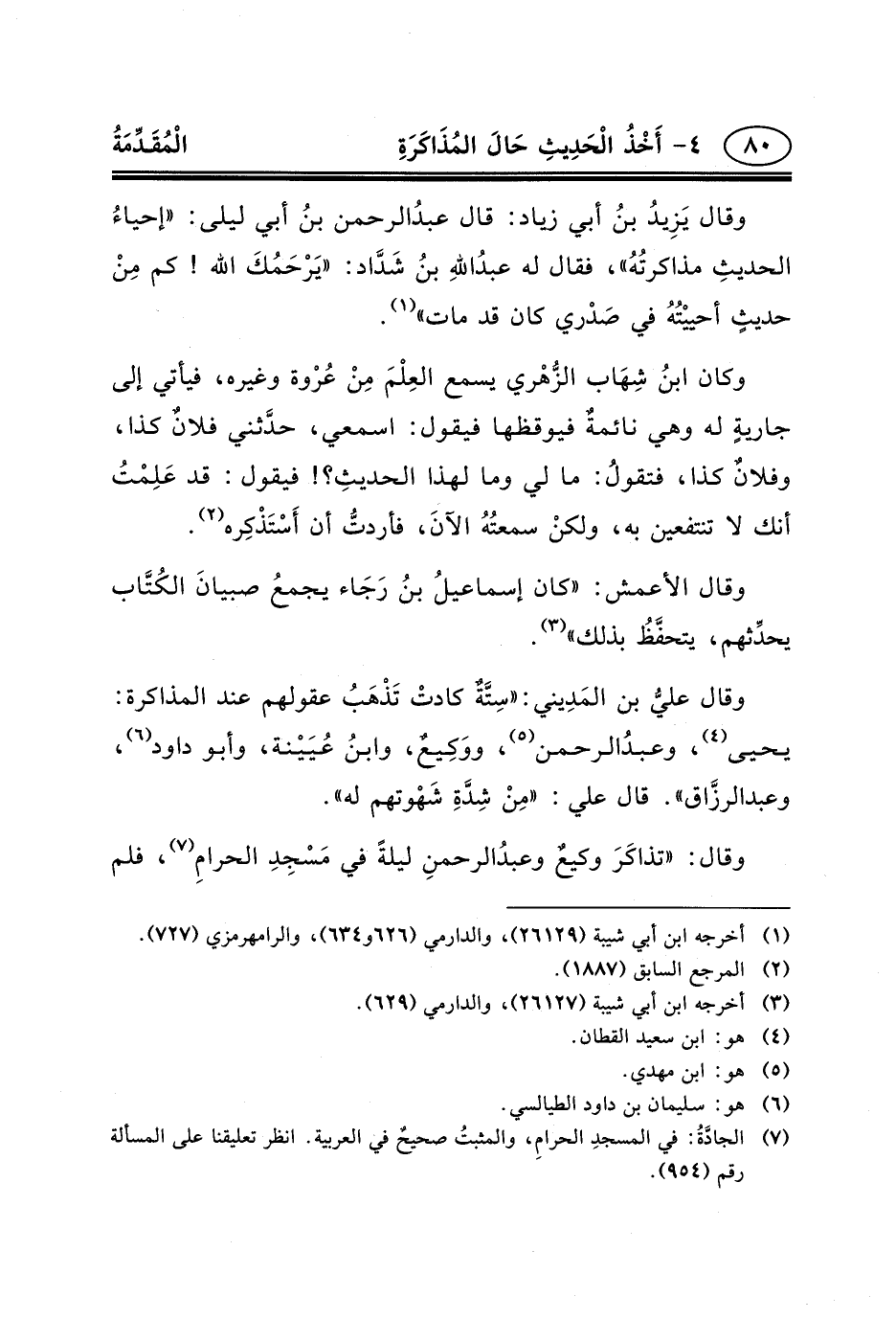 وقال يَزِيدُ بنُ أَبِي زِيَادٍ: قَالَ عبدُالرحمن بنُ أبي ليلى: «إحياءُ الحديثِ مذاكرتُهُ» ، فقال له عبدُاللهِ بنُ شَدَّاد: «يَرْحَمُكَ الله! كم مِنْ حديثٍ أحييْتُهُ في صَدْري كان قد مات» (١) .