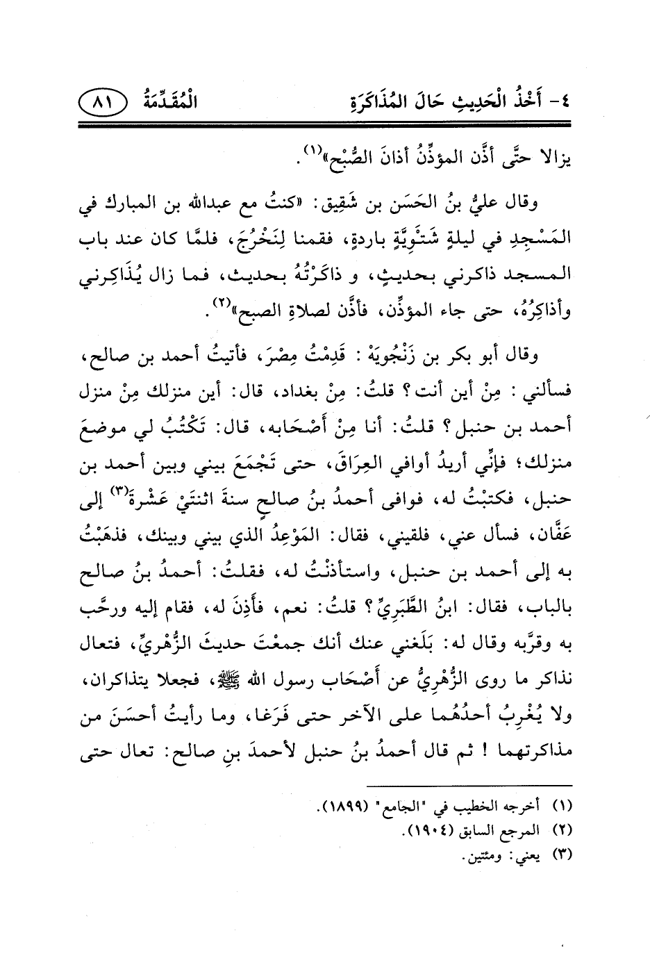 وقال عليُّ بنُ الحَسَن بْنِ شَقِيق: «كنتُ مع عبد الله بن المبارك في المَسْجِدِ في ليلةٍ شَتْ َوِيَّةٍ باردةٍ، فقمنا لِنَخْرُجَ، فلمَّا كان عند باب المسجد ذاكرني بحديثٍ، وذاكَرْتُهُ بحديث، فما زال يُذَاكِرني وأذاكِرُهُ، حتى جاء المؤذِّن، فأذَّن لصلاةِ الصبح» (٢) .