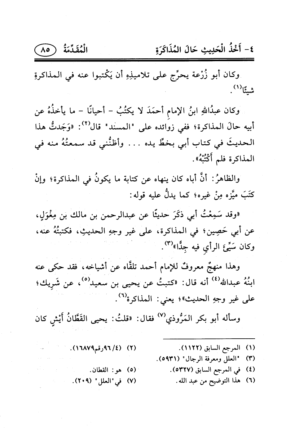 وهذا منهجٌ معروفٌ للإمام أحمد تلقَّاه عن أشياخه، فقد حكى عنه ابنُهُ عبد الله (٤) أنه قال: «كتبتُ عَنْ يَحْيَى بْنِ سَعِيدٍ (٥) ، عَنْ شَرِيك؛ على غير وجهِ الحديث» ؛ يعني: المذاكرة (٦) .