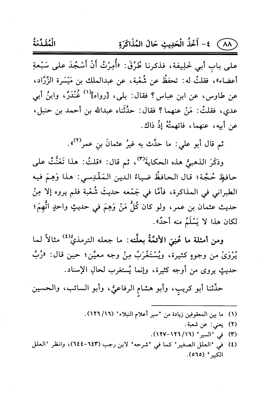 وذكَرَ الذهبيُّ هذه الحكايةَ (٣) ، ثم قال: «قلتُ: هذا تَعَنُّتٌ على حافظٍ حُجَّة؛ قال الحافظُ ضياءُ الدين المَقْدِسي: هذا وَهِمَ فيه الطبراني في المذاكرة، فأمَّا في جَمْعه حديثَ شُعْبة فلم يروه إلا مِنْ حديث عثمان بن عمر، ولو كان كُلُّ مَنْ وَهِمَ في حديثٍ واحدٍ اتُّهِمَ؛ لكان هذا لا يَسْلَمُ منه أحدٌ» .