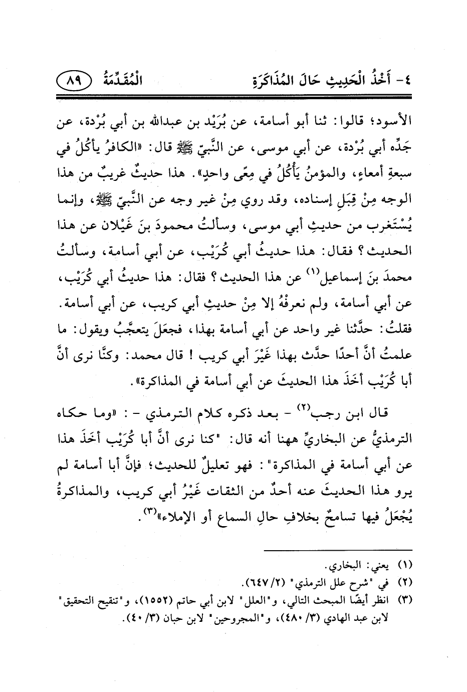 قال ابن رجب (٢) - بعد ذكره كلام الترمذي -: «وما حكاه الترمذيُّ عن البخاريِّ ههنا أنه قال: "كنا نرى أنَّ أبا كُرَيْب أخَذَ هذا عن أبي أسامة في المذاكرة": فهو تعليلٌ للحديث؛ فإنَّ أبا أسامة لم يرو هذا الحديثَ عنه أحدٌ من الثقات غَيْرُ أبي كريب، والمذاكرةُ يُجْعَلُ فيها تسامحٌ بخلافِ حالِ السماع أو الإملاء» (٣) .