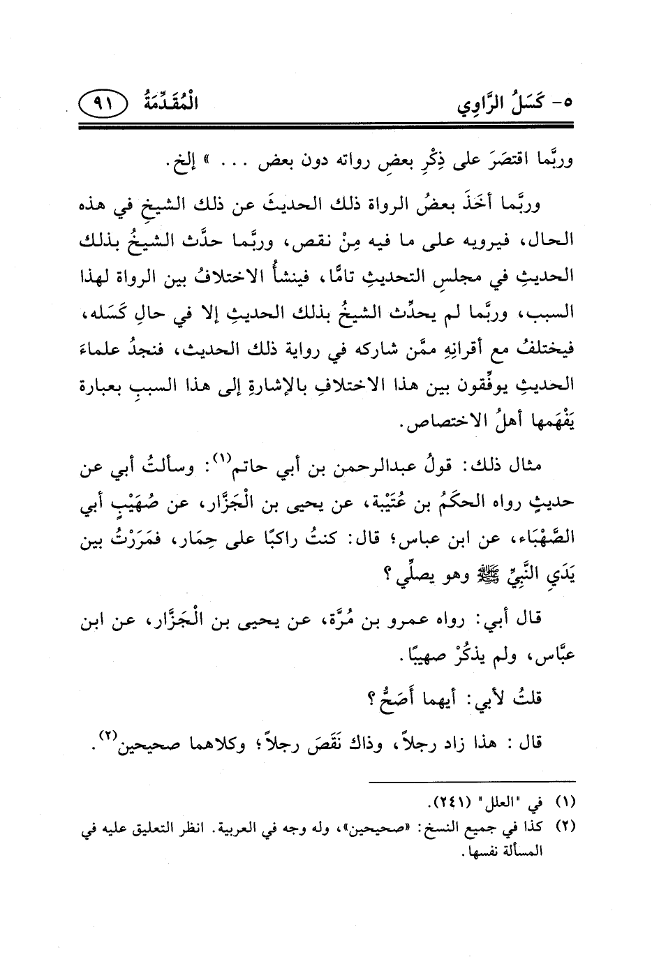 مثال ذلك: قولُ عبد الرحمن بن أبي حاتم (١) : وسألتُ أَبِي عَنْ حديثٍ رَوَاهُ الحكَمُ ابن عُتَيْبة، عَنْ يَحْيَى بْنِ الْجَزَّار، عَنْ صُهَيْبٍ أَبِي الصَّهْبَاء، عَنِ ابْنِ عَبَّاسٍ؛ قَالَ: كنتُ رَاكِبًا عَلَى حِمَار، فمَرَرْتُ بَيْنَ يَدَيِ النَّبِيِّ (ص) وَهُوَ يصلِّي؟
