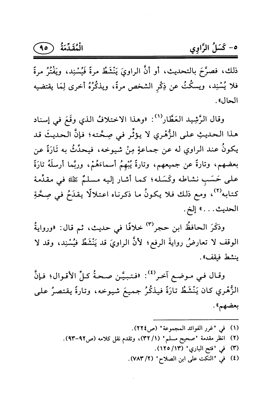وقال الرَّشِيد العَطَّار (١) : «وهذا الاختلافُ الذي وقَعَ في إسناد هذا الحديثِ على الزُّهْري لا يؤثِّر في صِحَّته؛ فإنَّ الحديثَ قد يكونُ عند الراوي له عن جماعةٍ مِنْ شيوخه، فيحدِّثُ به تَارَةً عن بعضهم، وتارةً عن جميعهم، وتارةً يُبْهِمُ أسماءَهُمْ، وربَّما أرسلَهُ تارَةً على حَسَبِ نشاطه وكَسَله؛ كما أشار إليه مسلمٌ _ح في مقدِّمة كتابه (٢) ، ومع ذلك فلا يكونُ ما ذكرناه اعتلالاً يقدَحُ في صِحَّةِ الحديث ... » إلخ.
