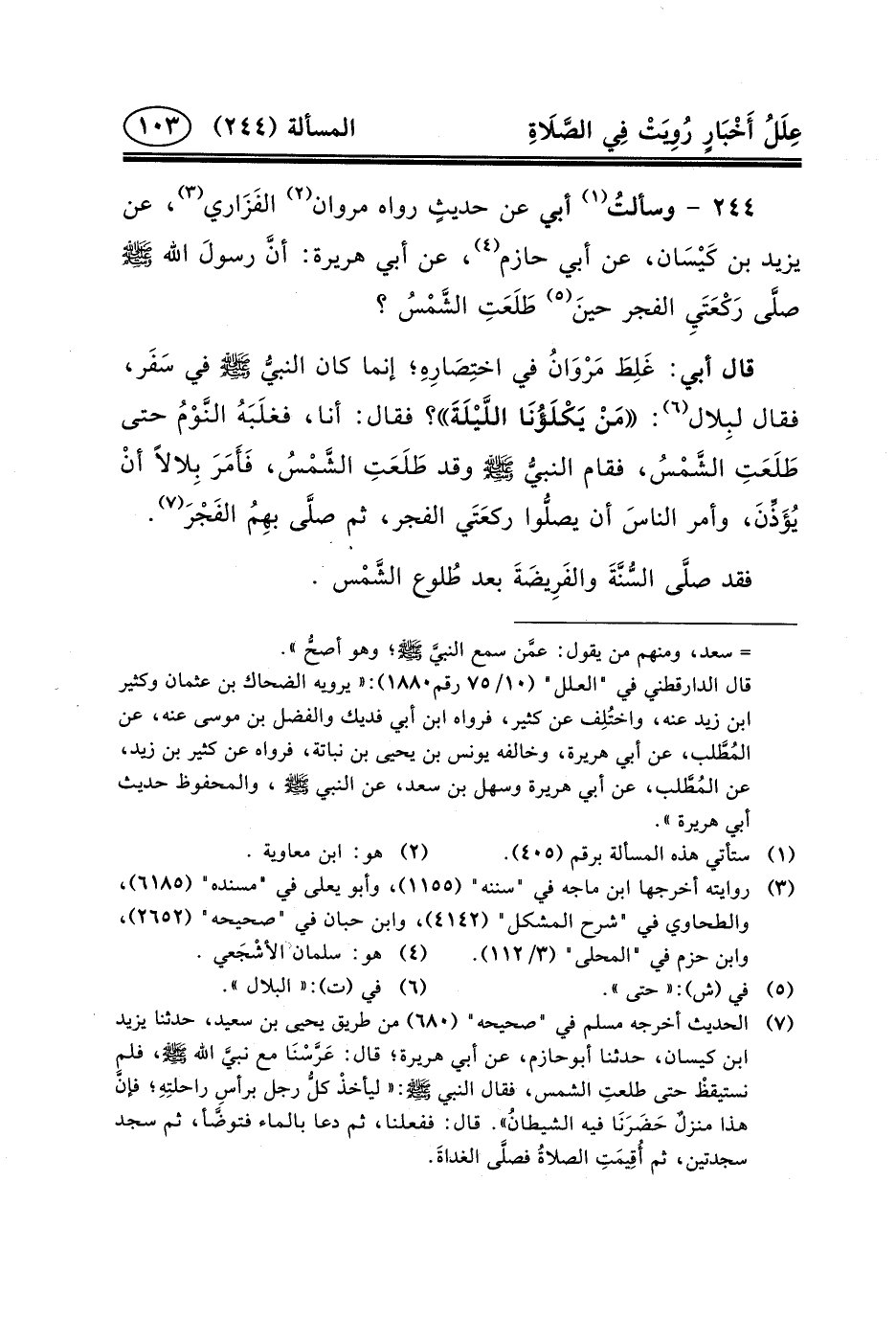 ٢٤٤ - وسألتُ (١) أَبِي عَنْ حديثٍ رَوَاهُ مَرْوَانُ (٢) الفَزَاري (٣) ، عَنْ يَزِيدَ بْنِ كَيْسَان، عَنْ أَبِي حَازِمٍ (٤) ، عَنْ أَبِي هُرَيْرَةَ: أنَّ رسولَ اللَّهِ (ص) صلَّى رَكْعَتَيِ الْفَجْرِ حينَ (٥) طَلَعَتِ الشَّمْسُ؟