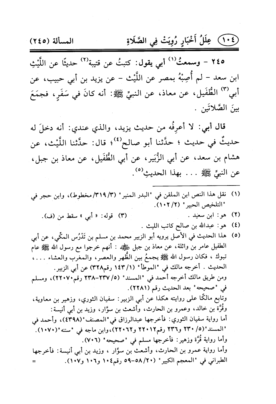 ٢٤٥ - وسمعتُ (١) أَبِي يَقُولُ: كتبتُ عَن قُتَيْبَة (٢) حديثًا عَنِ اللَّيْثِ بْن سَعْد - لم أُصِبْهُ بِمصر عَنِ اللَّيْث - عَنْ يَزِيدَ بْنِ أَبِي حَبِيبٍ، عَنْ أَبِي (٣) الطُّفَيل، عَن معاذ، عن النبيِّ (ص) : أَنَّهُ كانَ فِي سَفَرٍ، فجمَعَ بينَ الصَّلاتَين.