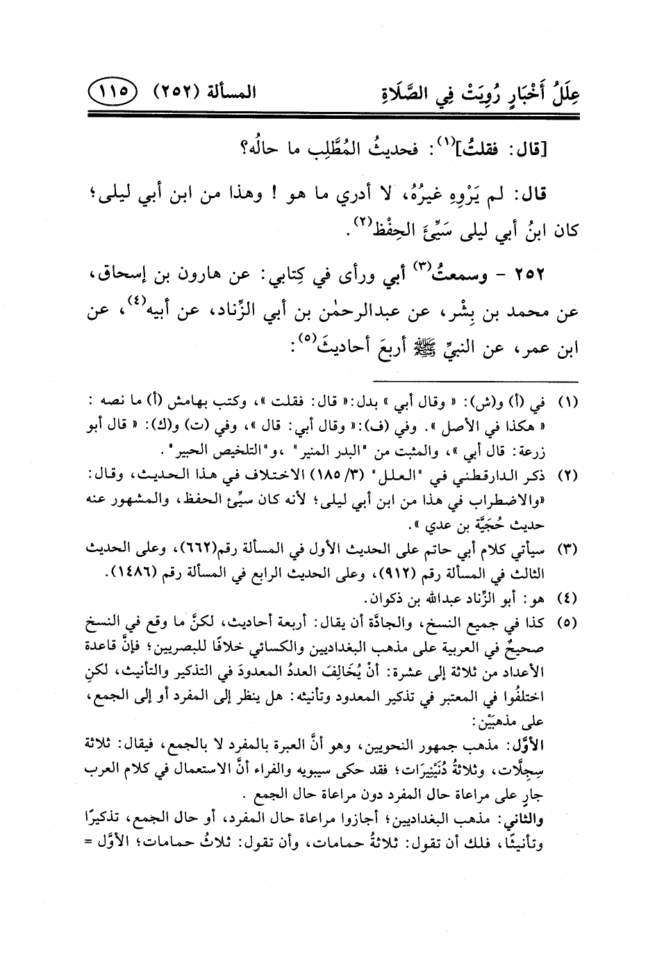 ٢٥٢ - وسمعتُ (٣) أَبِي وَرَأَى فِي كِتابي: عَنْ هَارُونَ بْنِ إِسْحَاقَ، عَنْ مُحَمَّدِ بْنِ بِشْر، عن عبد الرحمن بْنِ أَبِي الزِّناد، عَنْ أَبِيهِ (٤) ، عَنِ ابْنِ عُمَرَ، عَنِ النبيِّ (ص) أربعَ أحاديثَ (٥) :
