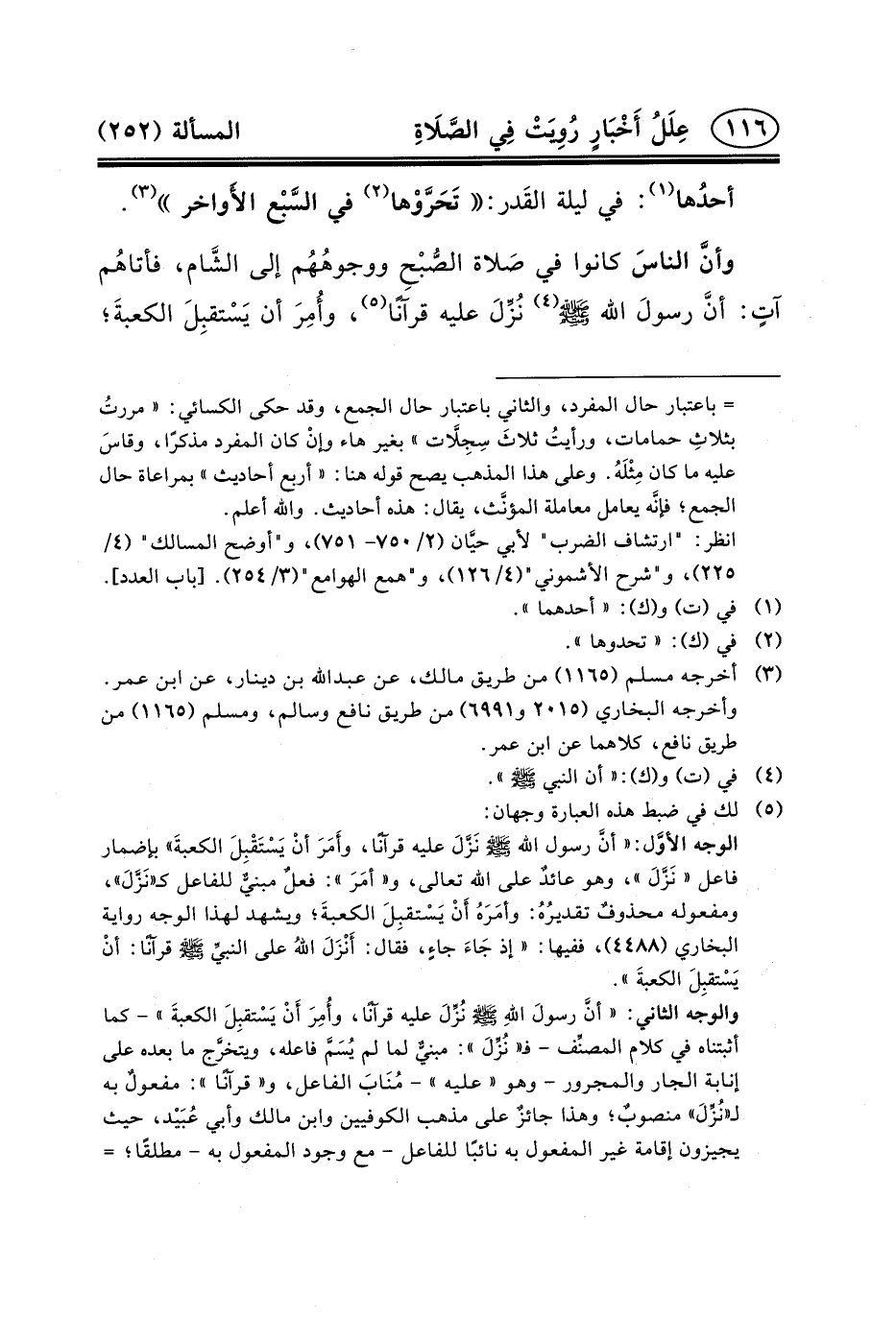 الوجه الأوَّل: «أنَّ رسول الله (ص) نَزَّلَ عليه قرآنًا، وأَمَرَ أنْ يَسْتَقْبِلَ الكعبةَ» بإضمار فاعل «نَزَّلَ» ، وهو عائدٌ على الله تعالى، و «أمَرَ» : فعلٌ مبنيٌّ للفاعل كـ «نَزَّلَ» ، ومفعوله محذوفٌ تقديرُهُ: وأمَرَهُ أَنْ يَسْتقبِلَ الكعبةَ؛ ويشهد لهذا الوجه رواية البخاري (٤٤٨٨) ، ففيها: «إذ جَاءَ جاءٍ، فقال: أَنْزَلَ اللهُ على النبيِّ (ص) قرآنًا: أنْ يَسْتقبِلَ الكعبةَ» .