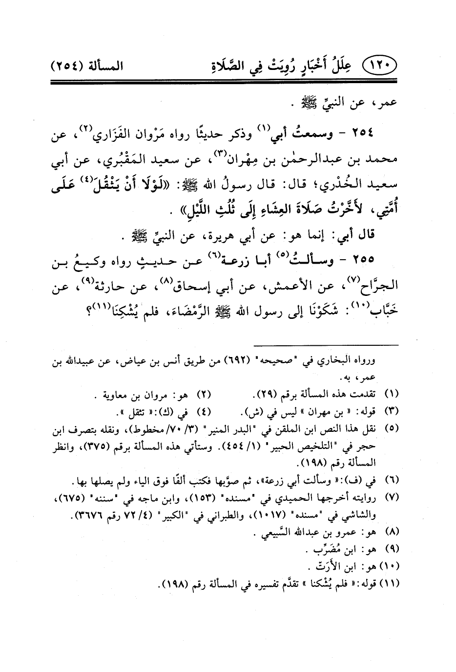 ٢٥٤ - وسمعتُ أَبِي (١) وَذَكَرَ حَدِيثًا رَوَاهُ مَرْوان الفَزَاري (٢) ، عَنْ مُحَمَّدِ بْنِ عبد الرحمن ابن مِهْران (٣) ، عَنْ سَعِيدٍ المَقْبُري، عَنْ أَبِي سَعِيدٍ الخُدْري؛ قَالَ: قَالَ رسولُ الله (ص) : لَوْلَا أَنْ يَثْقُلَ (٤) عَلَى أُمَّتِي، لأَخَّرْتُ صَلَاةَ العِشَاءِ إِلَى ثُلُثِ اللَّيْلِ.