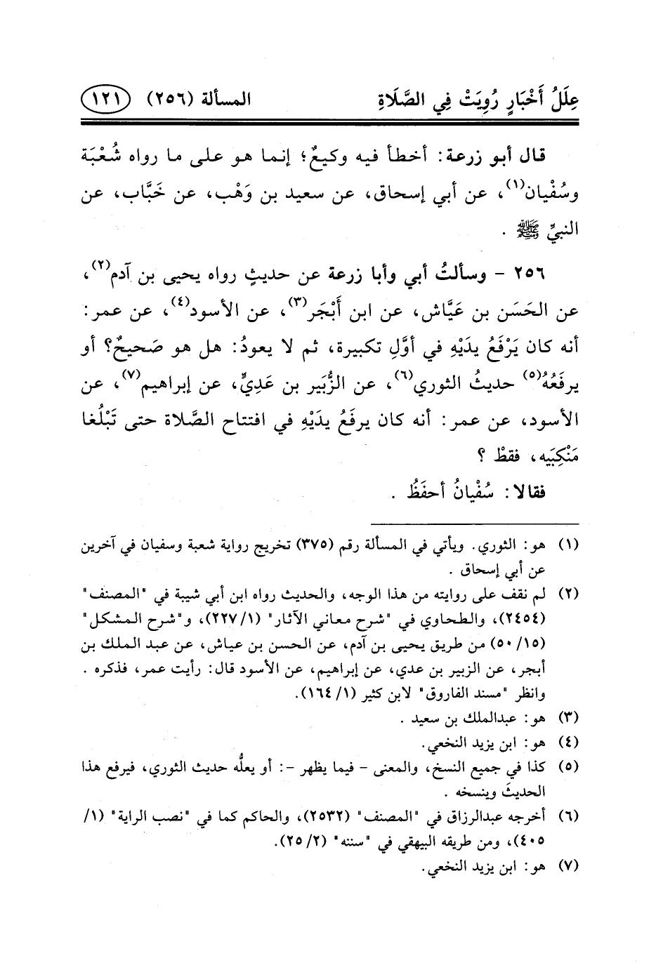 ٢٥٦ - وسألتُ أَبِي وَأَبَا زُرْعَةَ عَنْ حديثٍ رَوَاهُ يَحْيَى بْنُ آدم (٢) ، عَنِ الحَسَن بْنِ عَيَّاش، عَنِ ابْنِ أَبْجَر (٣) ، عَنِ الأَسْوَدِ (٤) ، عَنْ عُمَرَ: أَنَّهُ كَانَ يَرْفَعُ يدَيْهِ فِي أوَّلِ تكبيرة، ثُمَّ لا يعودُ: هَلْ هُوَ صَحيحٌ؟ أو يرفَعُهُ (٥) حديثُ الثوري (٦) ، عَنِ الزُّبَير بْن عَدِيٍّ، عَنْ إِبْرَاهِيمَ (٧) ، عَنِ الأَسْوَدِ، عَنْ عُمَرَ: أَنَّهُ كَانَ يرفَعُ يدَيْهِ فِي افتتاح الصَّلاة حَتَّى تَبْلُغا مَنْكِبَيه، فقطْ؟