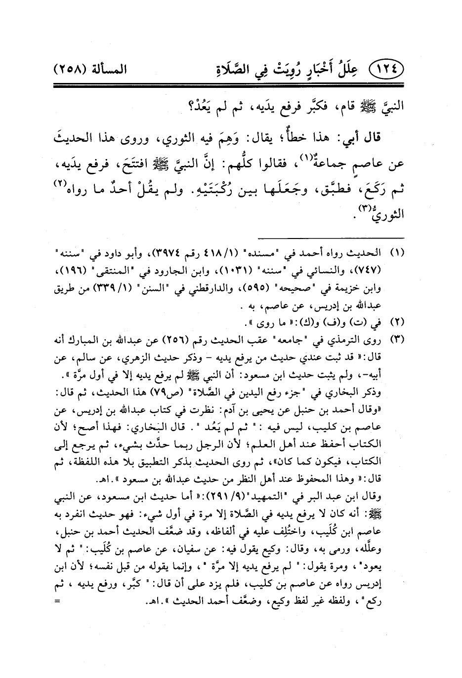 وذكر عبد الله بن أحمد في "العلل" (٧٠٨) حديث يزيد ابن أبي زياد، عن عبد الرحمن بْنِ أَبِي لَيْلَى، عَن البراء ابن عازب في رفع اليدين عند تكبيرة الإحرام، وقال فيه: «ثم لم يَعُد» ، وذكر إعلال أبيه أحمد بن حنبل لهذا الحديث، ثم قال (٧٠٩-٧١٤) : قلت لأبي: حديث عاصم بن كليب: حديث عبد الله؟ قال: حدثناه وكيع في الجماعة؛ قال: حدثنا سفيان، عَنْ عَاصِمِ بْنِ كليب، عَنْ عبد الرحمن بن الأسود، عن علقمة؛ قال: قال ابن مسعود: ألا أصلي بكم صلاة رسول الله (ص) ؟ قال: فصلَّى، فلم يرفع يديه إلا مرَّة.