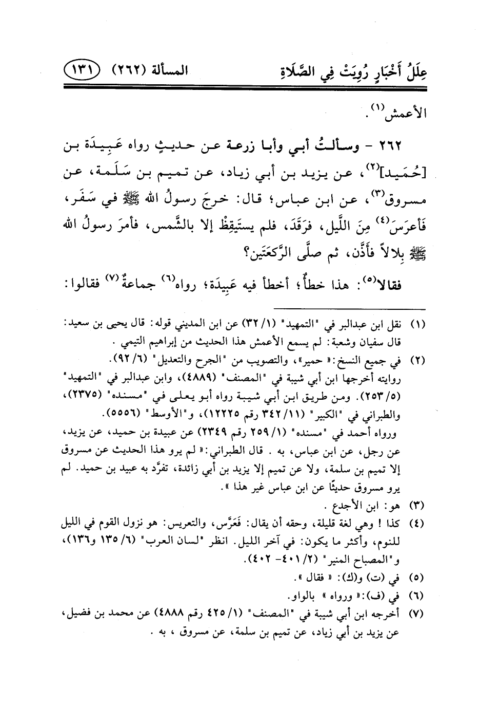 ٢٦٢ - وسألتُ أَبِي وَأَبَا زُرْعَةَ عَن حديثٍ رَوَاهُ عَبِيدَة بْن [حُمَيد] (٢) ،