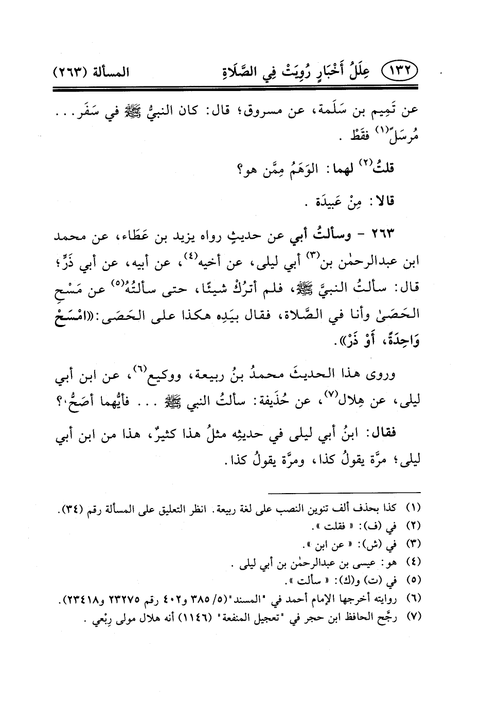 ٢٦٣ - وسألتُ أَبِي عَنْ حديثٍ رواه يزيد ابن عَطَاء، عن محمد بن عبد الرحمن بْنِ (٣) أَبِي لَيْلَى، عَنْ أَخِيهِ (٤) ، عَنْ أَبِيهِ، عَنْ أَبِي ذَرٍّ؛ قال: سألتُ النبيَّ (ص) ، فلم أترُكْ شيئًا، حتى سألتُهُ (٥) عن مَسْحِ الحَصَى وَأَنَا فِي الصَّلاة، فَقَالَ بيَدِه هكذا على الحَصَى: امْسَحْ وَاحِدَةً، أَوْ ذَرْ.