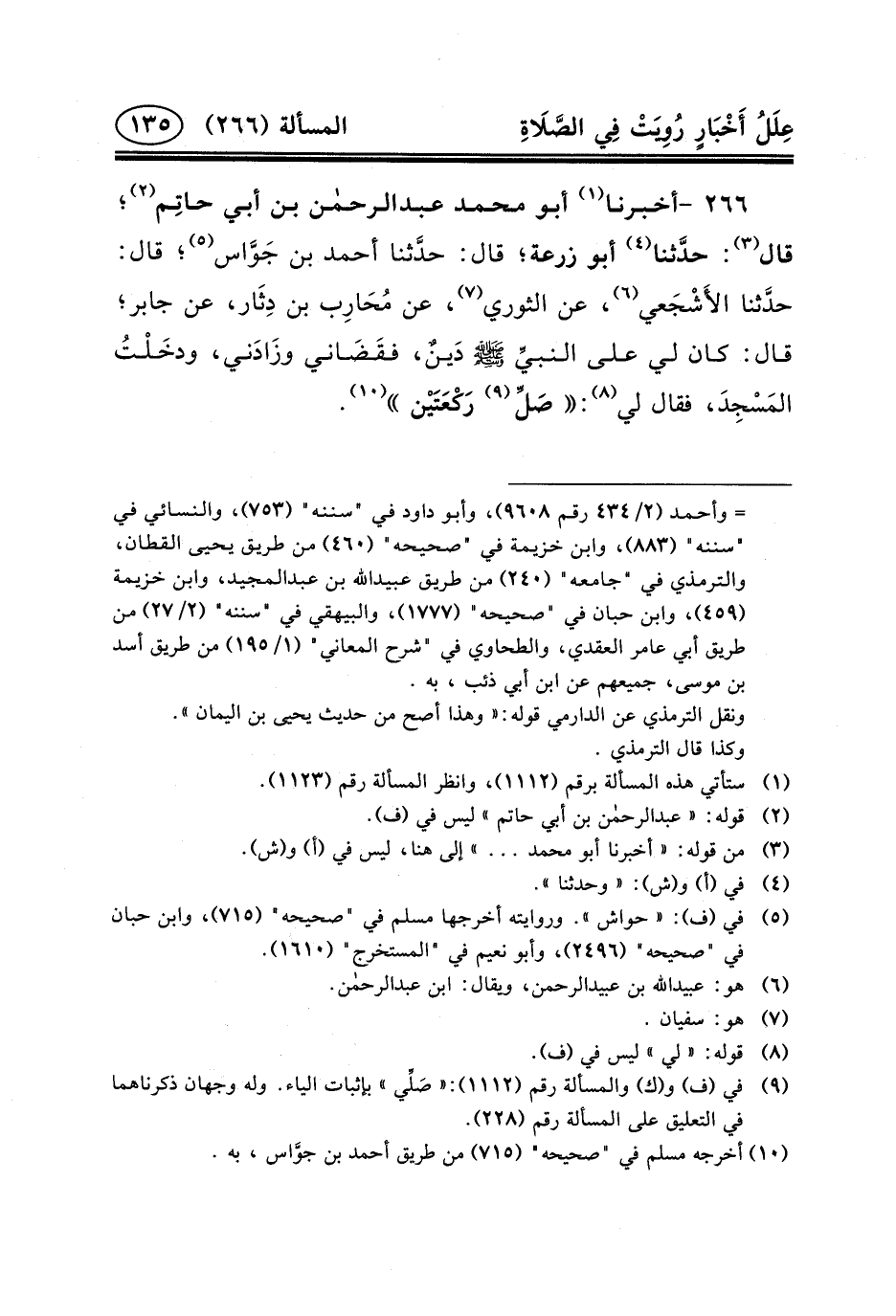 ٢٦٦ -أخبرنا (١) أبو محمد عبد الرحمن ابن أَبِي حاتِم (٢) ؛ قَالَ (٣) : حدَّثنا (٤) أَبُو زُرْعَةَ؛ قَالَ: حدَّثنا أَحْمَدُ بْنُ جَوَّاس (٥) ؛ قَالَ: حدَّثنا الأَشْجَعي (٦) ، عَنِ الثَّوْرِيِّ (٧) ، عَنْ مُحَارِب بْنِ دِثَار، عَنْ جَابِرٍ؛ قَالَ: كَانَ لِي على النبيِّ (ص) دَينٌ، فقَضَاني وزَادَني، ودخَلْتُ المَسْجِدَ، فقال لي (٨) : صَلِّ (٩) رَكْعَتَيْن (١٠) .