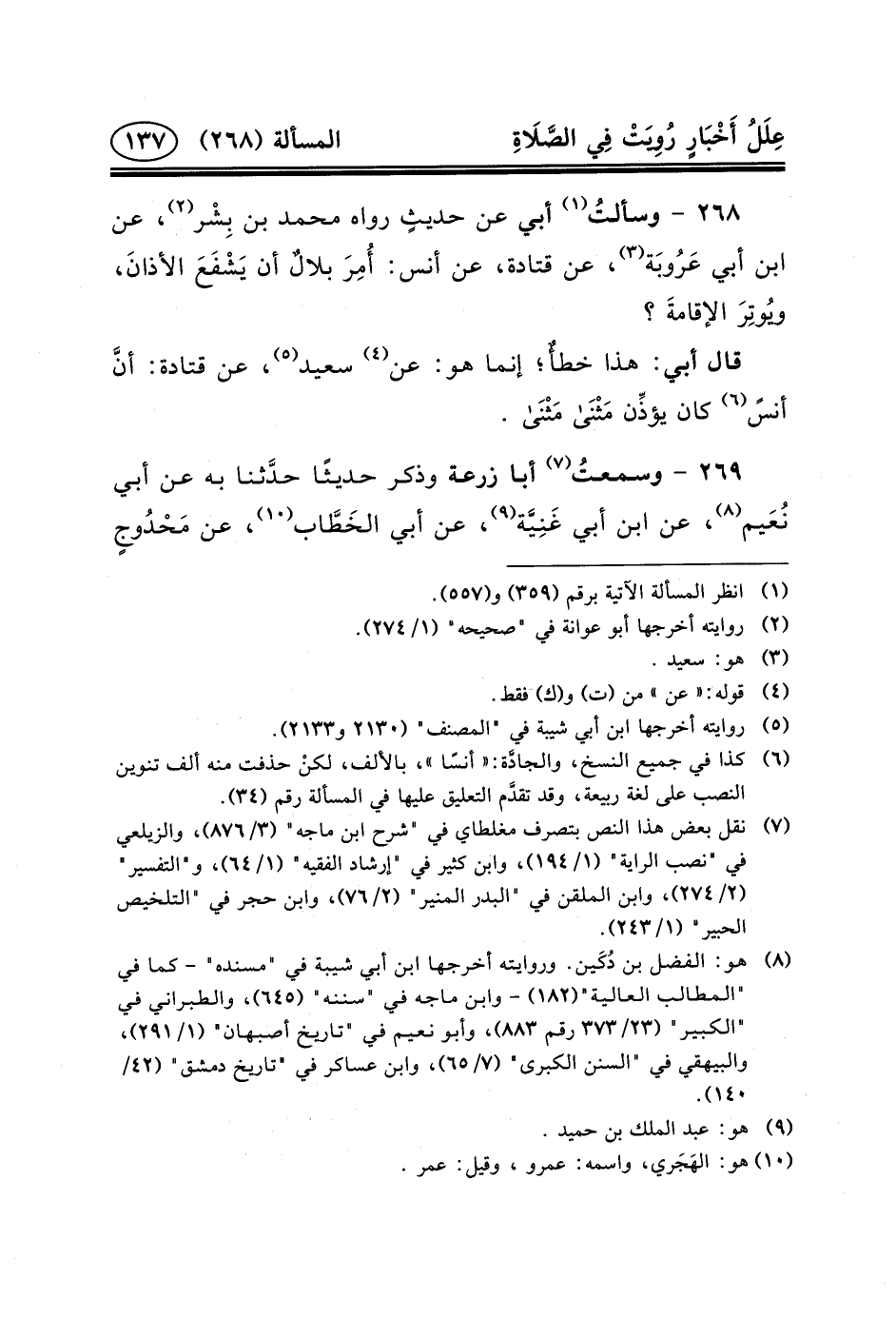 ٢٦٨ - وسألتُ (١) أَبِي عَنْ حديثٍ رَوَاهُ مُحَمَّدُ بْنُ بِشْر (٢) ، عَنِ ابْنِ أَبِي عَرُوبَة (٣) ، عَنْ قَتَادَةَ، عَن أَنَسٍ: أُمِرَ بلالٌ أَنْ يَشْفَعَ الأذانَ، ويُوتِرَ الإقامةَ؟