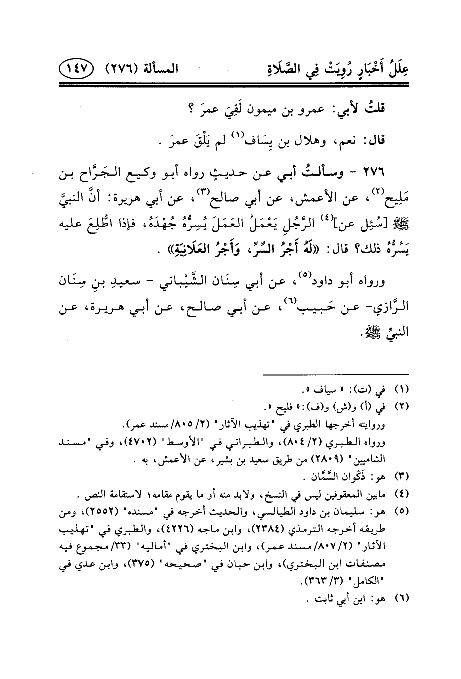 ٢٧٦ - وسألتُ أَبِي عَنْ حديثٍ رَوَاهُ أَبُو وَكِيعٍ الجَرَّاح بْنُ مَلِيح (٢) ، عَنِ الأَعْمَشِ، عَنْ أَبِي صَالِحٍ (٣) ، عَنْ أَبِي هُرَيْرَةَ: أنَّ النبيَّ (ص) [سُئِل عن] (٤) الرَّجُلِ يَعْمَلُ العَمَلَ يُسِرُّهُ جُهْدَهُ، فَإِذَا اطُّلِعَ عَلَيْهِ يَسُرُّهُ ذَلِكَ؟ قَالَ: لَهُ أَجْرُ السِّرِّ، وَأَجْرُ العَلَانِيَةِ.