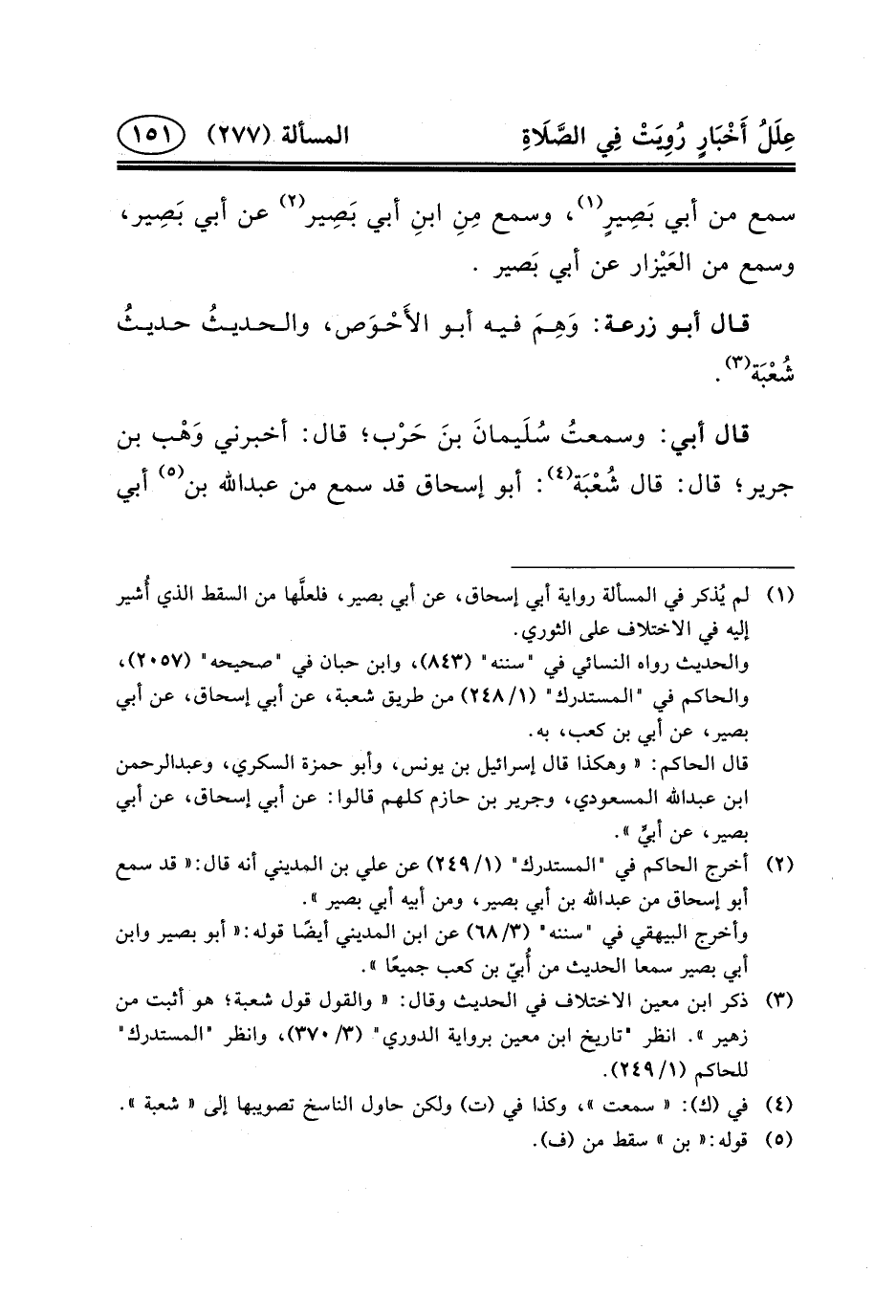 (١) لم يُذكر في المسألة رواية أبي إسحاق، عن أبي بصير، فلعلَّها من السقط الذي أُشير إليه في الاختلاف على الثوري.