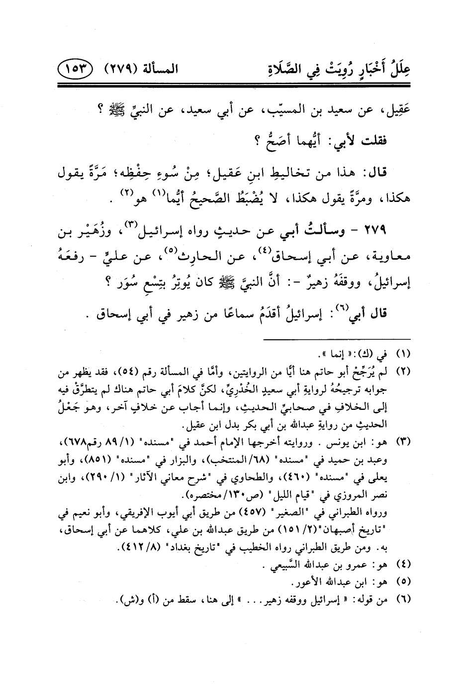 ٢٧٩ - وسألتُ أَبِي عَنْ حديثٍ رَوَاهُ إِسْرَائِيلُ (٣) ، وزُهَيْر بْنُ مُعَاوِيَةَ، عَنْ أَبِي إِسْحَاقَ (٤) ، عَنِ الحارِث (٥) ، عَنْ عليٍّ - رفعَهُ إسرائيلُ، ووقفَهُ زهيرٌ -: أنَّ النبيَّ (ص) كَانَ يُوتِرُ بتِسْعِ سُوَر؟