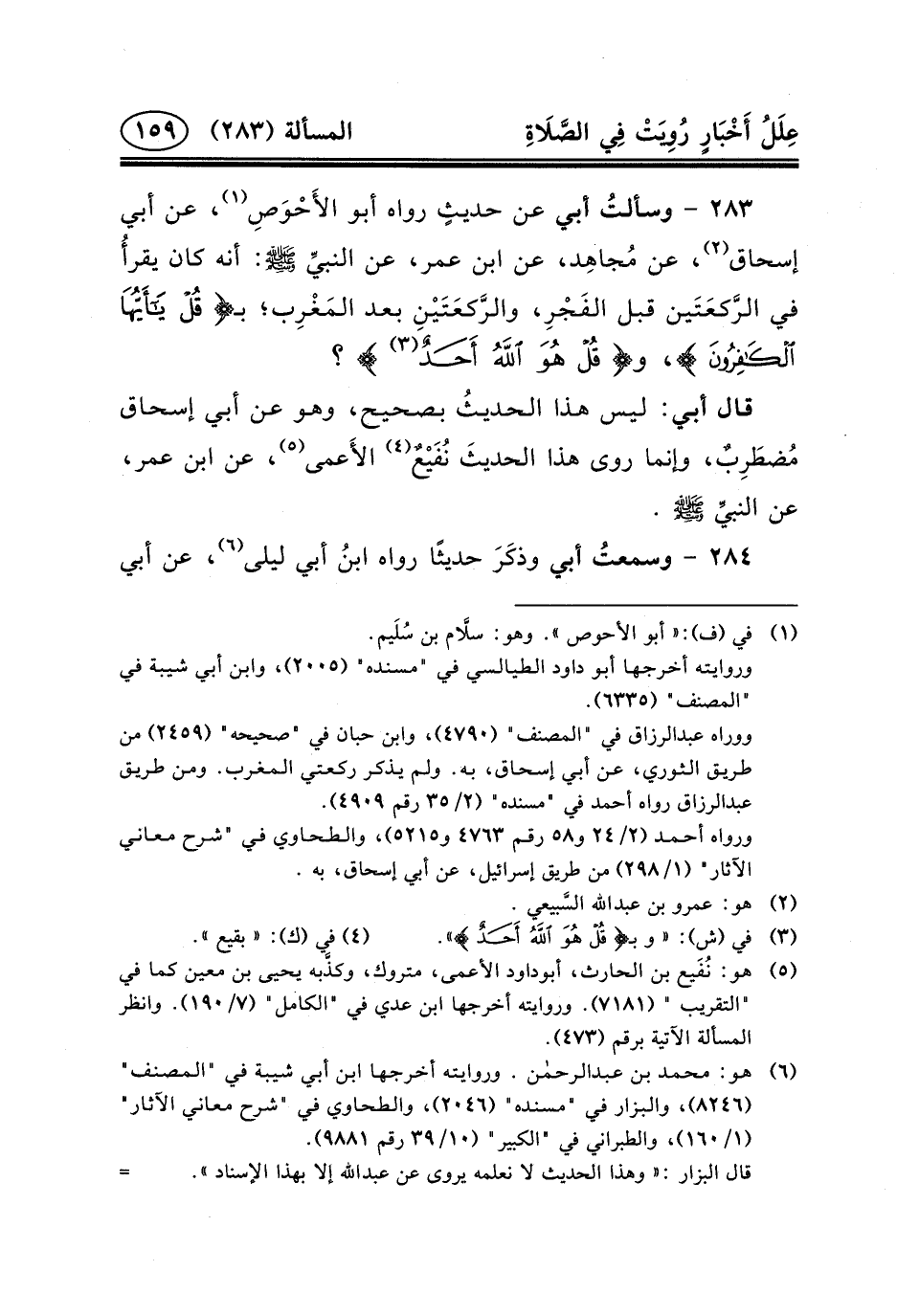 ٢٨٣ - وسألتُ أَبِي عَنْ حديثٍ رَوَاهُ أَبُو الأَحْوَصِ (١) ، عَنْ أَبِي إِسْحَاقَ (٢) ، عَنْ مُجاهِد، عَنِ ابْنِ عُمَرَ، عن النبيِّ (ص) : أَنَّهُ كَانَ يقرأُ فِي الرَّكعَتَين قَبْلَ الفَجْرِ، والرَّكعَتَيْنِ بَعْدَ المَغْرِب؛ بـ {قُلْ يَاأَيُّهَا الْكَافِرُونَ *} ، وَ {قُلْ هُوَ اللَّهُ أَحَدٌ *} (٣) ؟