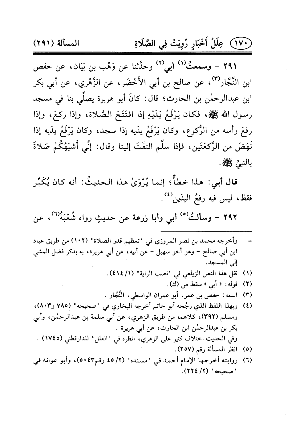 ٢٩١ - وسمعتُ (١) أَبِي (٢) وحدَّثنا عَن وَهْب بْن بَيَان، عَنْ حَفْصِ بْنِ النَّجَّار (٣) ، عَنْ صَالِحِ بْنِ أَبِي الأَخْضَر، عَنِ الزُّهْري، عَنْ أَبِي بكر بن عبد الرحمن بْنِ الْحَارِثِ؛ قَالَ: كانَ أَبُو هُرَيْرَةَ يصلِّي بنا فِي مسجد رسول الله (ص) ، فكان يَرْفَعُ يَدَيْهِ إِذَا افتَتَحَ الصَّلاة، وَإِذَا ركعَ، وَإِذَا رفعَ رأسه من الرُّكوع، وَكَانَ يَرْفَعُ يدَيه إِذَا سجد، وَكَانَ يَرْفَعُ يدَيه إِذَا نَهَضَ من الرَّكعَتَين، فَإِذَا سلَّم التفَتَ إلينا وَقَالَ: إنِّي أَشبَهُكُمْ صَلاةً بالنبيِّ (ص) .
