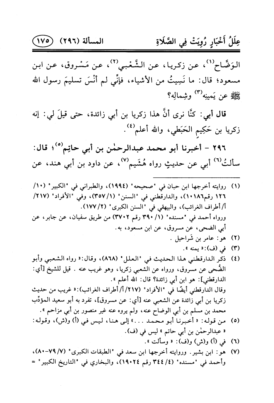 (٤) ذكر الدارقطني هذا الحديث في "العلل" (٨٦٨) ، وقال: «رواه الشعبي وأبو الضُّحى عن مسروق، ورواه عن الشعبي زكريا، وهو غريب عنه. قيل للشيخ [أي: الدارقطني] : هو ابن أبي زائدة؟ قال: الله أعلم» .