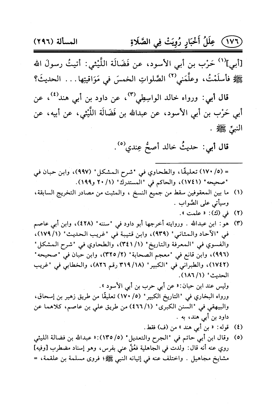 [أَبِي] (١) حَرْب بْن أَبِي الأسود، عن فَضَالَة اللَّيْثي: أتيتُ رسولَ الله (ص) فأسلَمْتُ، وعلَّمَني (٢) الصَّلواتِ الخمسَ فِي مَوَاقيتِها ... الحديثَ؟