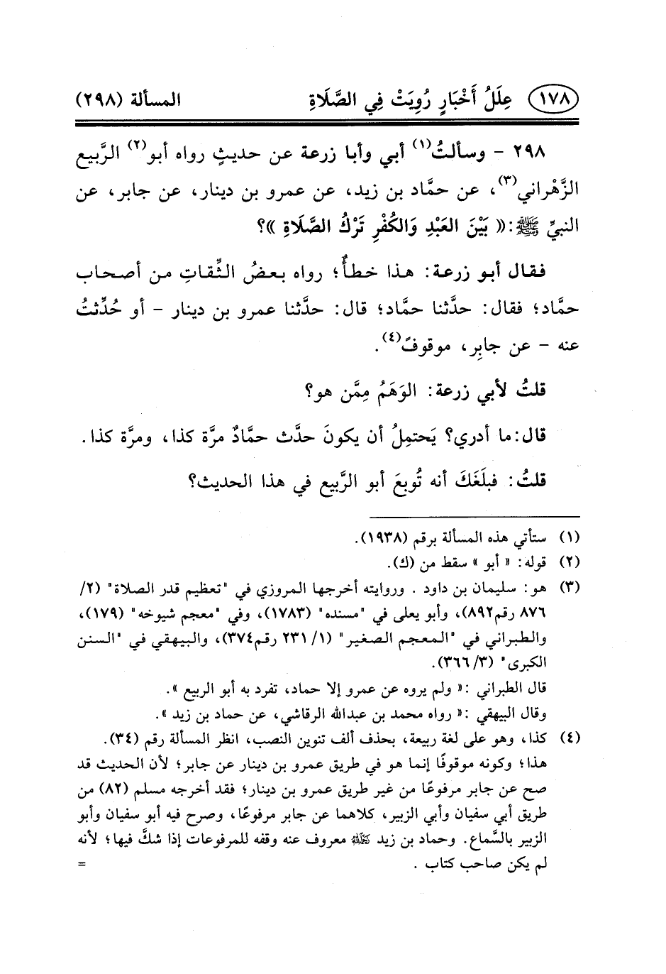 ٢٩٨ - وسألتُ (١) أَبِي وَأَبَا زُرْعَةَ عَنْ حديثٍ رَوَاهُ أَبُو (٢) الرَّبيع الزَّهْراني (٣) ، عَنْ حمَّاد بْنِ زَيْدٍ، عَنْ عَمْرِو بْنِ دِينَارٍ، عَنْ جَابِرٍ، عن النبيِّ (ص) : بَيْنَ العَبْدِ وَالكُفْرِ تَرْكُ الصَّلَاةِ؟