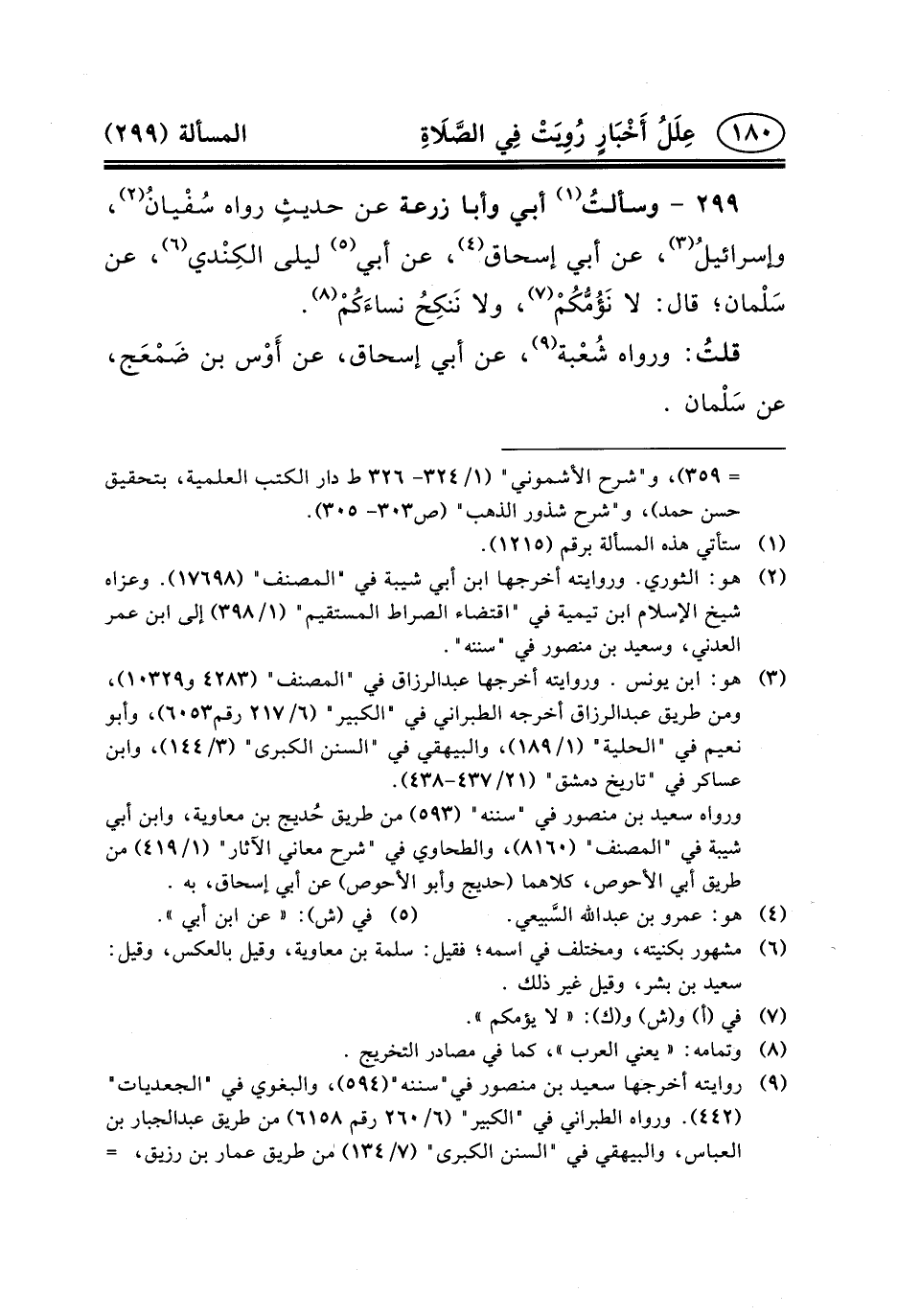 ٢٩٩ - وسألتُ (١) أَبِي وَأَبَا زُرْعَةَ عَنْ حديثٍ رَوَاهُ سُفْيانُ (٢) ، وإسرائيلُ (٣) ، عَنْ أَبِي إِسْحَاقَ (٤) ، عَنْ أَبِي (٥) لَيْلَى الكِنْدي (٦) ، عَنْ سَلْمان؛ قَالَ: لا نَؤُمُّكُمْ (٧) ، ولا نَنكِحُ نساءَكُمْ (٨) .