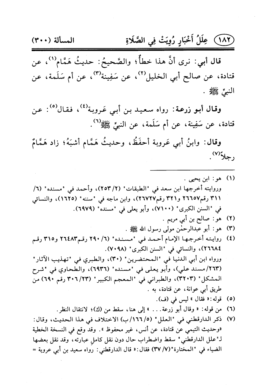 (٧) ذكر الدارقطني في "العلل" (٥/١٦٦/ب) الاختلاف في هذا الحديث، وقال: «وحديث التيمي عن قتادة، عن أنس، غير محفوظ» . وقد وقع في النسخة الخطية لـ"علل الدارقطني" سقط واضطراب حال دون نقل كاملِ عبارته، وقد نقل بعضها الضياء في "المختارة" (٧/٣٧) فقال: «قال الدارقطني: رَوَاهُ سَعِيدُ بْنُ أَبِي عَرُوبَةَ وأبو عوانة، عَنْ قَتَادَةَ، عَنْ سَفِينَةَ، عَنْ أم سلمة. وَقَالَ هَمَّامٌ: عَنْ قَتَادَةَ، عَنْ أَبِي الْخَلِيلِ، عَنْ سَفِينَةَ، عَنْ أم سلمة. قال: وهذا أصح، والله أعلم» . اهـ.
