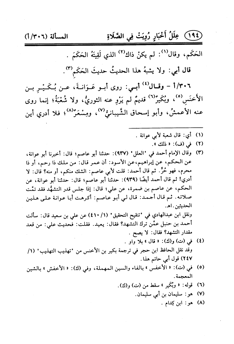 (٣) وقال الإمام أحمد في "العلل" (٩٣٧) : حدثنا أبو عاصم؛ قال: أخبرنا أَبُو عَوَانَةَ، عَنِ الْحَكَمِ، عَنْ إبراهيم، عن الأسود: أن عمر قال: من ملك ذا رحم، أو ذا محرم، فهو حُرٌّ. ثم قال أحمد: قلت لأبي عاصم: الشك منكم، أو منه؟ قال: لا أدري! ثم قال أحمد أيضًا (٩٣٩) : حدثنا أبو عاصم؛ قَالَ: حَدَّثَنَا أَبُو عوانة، عَن الْحَكَمِ، عَنْ عَاصِمِ بْنِ ضَمْرَةَ، عن علي؛ قال: إذا جلس قدر التشهُّد فقد تمَّت صلاته. ثم قال أحمد: قال لي أبو عاصم: أكرهت أبا عوانة على هذين الحديثين. اهـ.