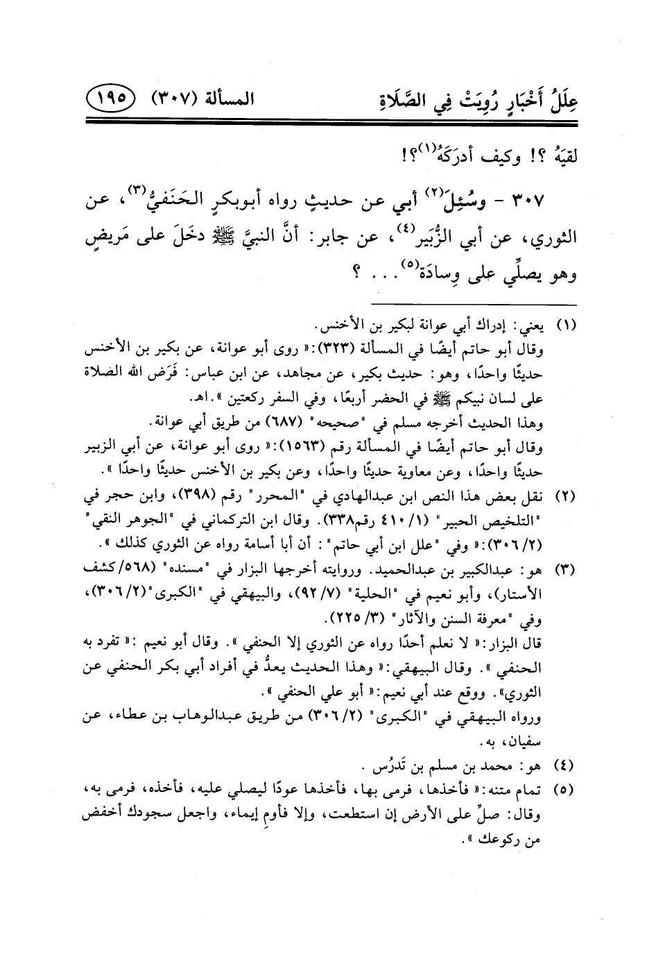 عَنِ الثَّوْرِيِّ، عَنْ أَبِي الزُّبَير (٤) ، عَن جَابِر: أنَّ النبيَّ (ص) دخَلَ عَلَى مَريضٍ وَهُوَ يصلِّي على وِسادَة (٥) ... ؟