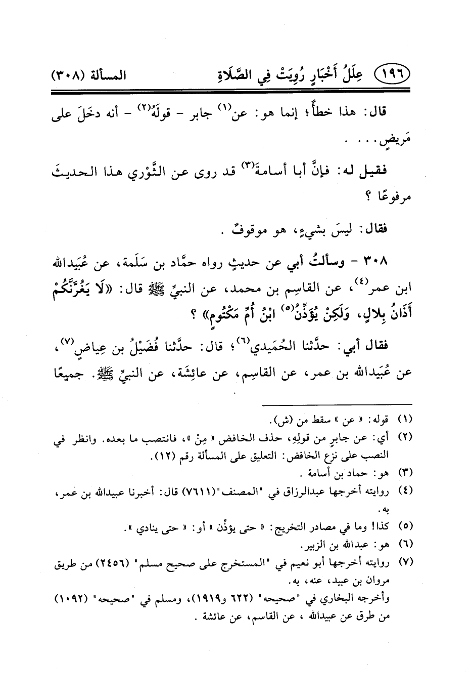 ٣٠٨ - وسألتُ أَبِي عَن حديثٍ رَوَاهُ حمَّاد ابن سَلَمة، عن عُبَيدالله بْنِ عُمَرَ (٤) ، عَنِ القاسِم بْنِ محمد، عن النبيِّ (ص) قَالَ: لَا يَغُرَّنَّكُمْ أَذَانُ بِلالٍ، وَلَكِنْ يُؤَذِّنُ (٥) ابْنُ أُمِّ مَكْتُومٍ؟