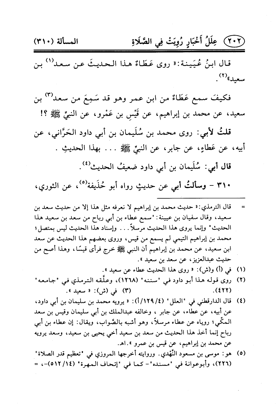 ٣١٠ - وسألتُ أَبِي عَنْ حديثٍ رَوَاهُ أبو حُذَيفة (٥) ، عن الثوري،