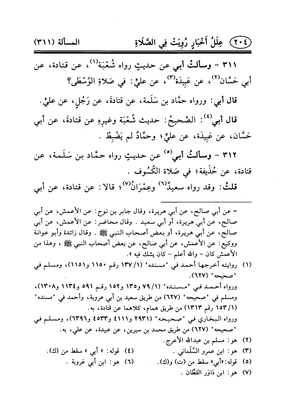 ٣١١ - وسألتُ أَبِي عَنْ حديثٍ رَوَاهُ شُعْبَة (١) ، عَنْ قَتَادَةَ، عَنْ أَبِي حَسَّان (٢) ، عَن عَبِيدَة (٣) ، عَن عليٍّ: فِي صَلاةِ الوُسْطَى؟