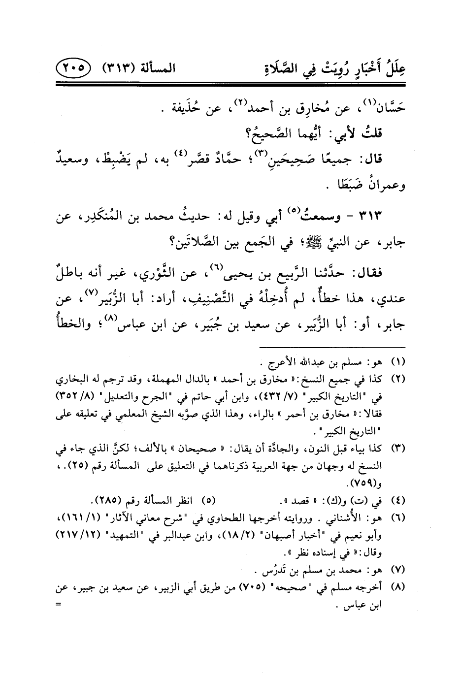٣١٣ - وسمعتُ (٥) أَبِي وقيل لَهُ: حديثُ مُحَمَّد بْن المُنكَدِر، عن جابر، عن النبيِّ (ص) ؛ فِي الجَمع بين الصَّلاتَين؟
