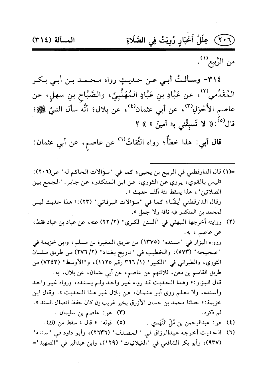 عَنْ عَبَّادِ بنِ عَبَّادٍ المُهَلَّبِيِّ، والصَّبَّاحِ بنِ سهلٍ، عَنْ عاصمٍ الأَحْوَلِ (٣) ، عَنْ أَبِي عُثْمَانَ (٤) ، عَنْ بِلالٍ؛ أنَّه سأل النبيَّ (ص) ؛ قَالَ (٥) : لا تَسبِقْني بِـ «آمينَ» ؟