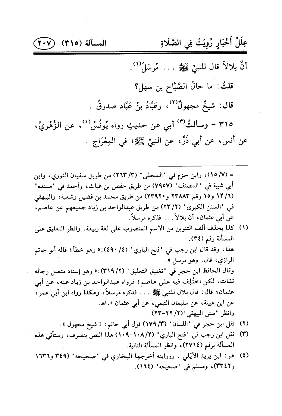 ٣١٥ - وسألتُ (٣) أَبِي عَنْ حديثٍ رَوَاهُ يُونُسُ (٤) ، عَنِ الزُّهْريِّ، عَنْ أَنَسٍ، عَنْ أبي ذَرٍّ، عن النبيِّ (ص) ؛ في المِعْرَاج.