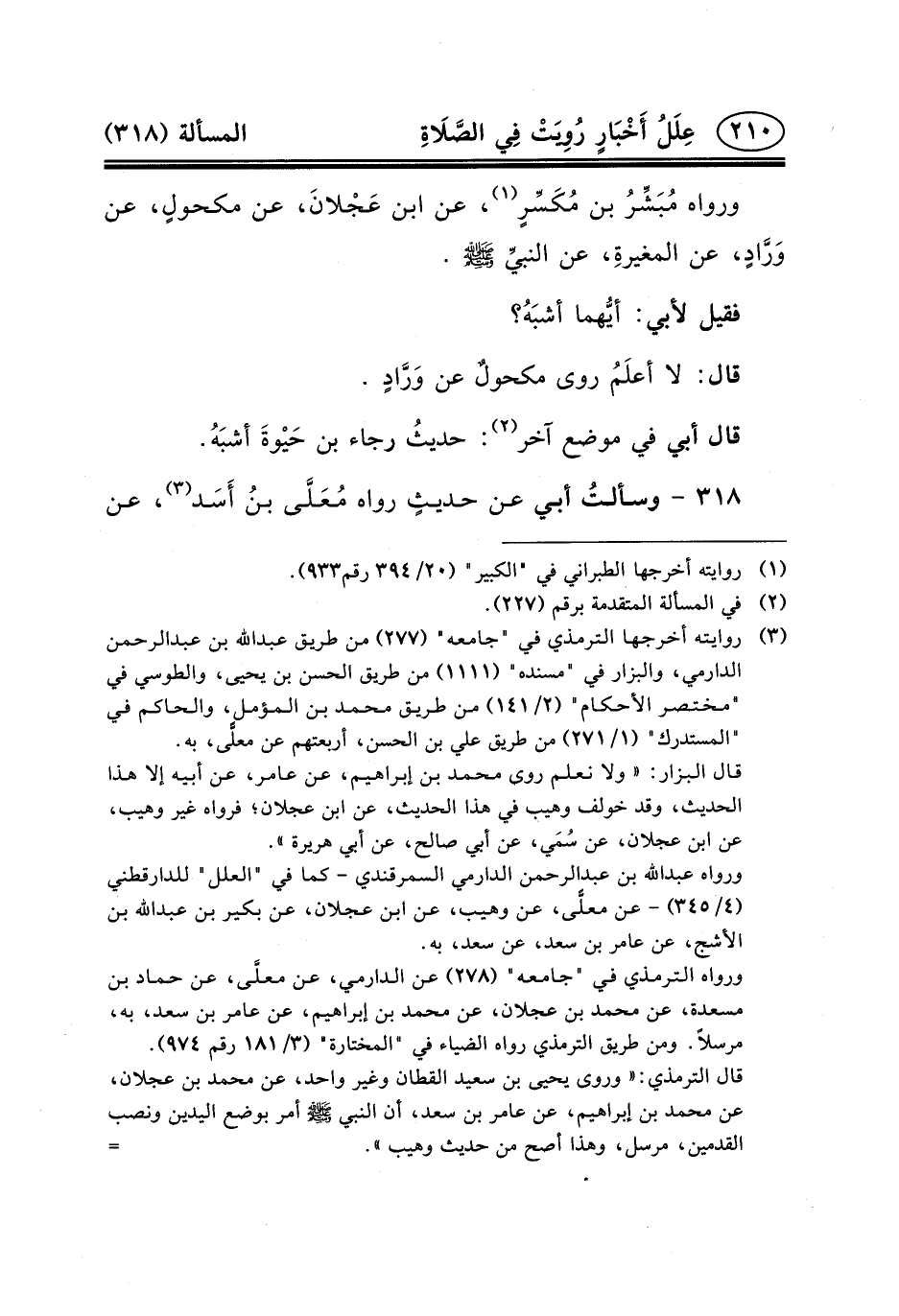 ٣١٨ - وسألتُ أَبِي عَنْ حديثٍ رَوَاهُ مُعَلَّى بنُ أَسَد (٣) ،