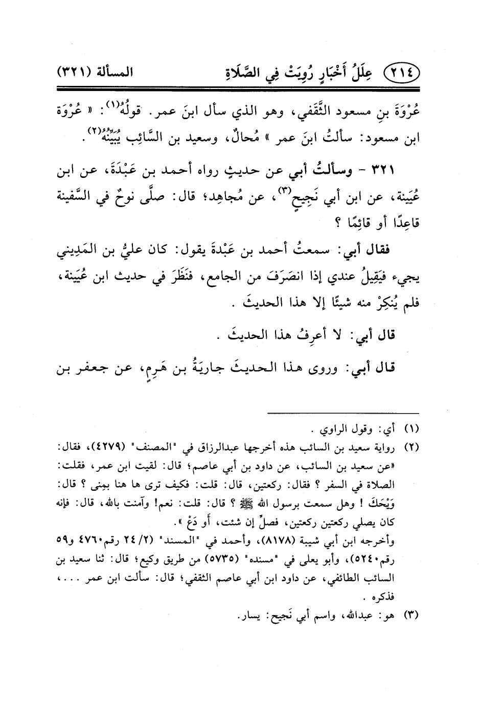 ٣٢١ - وسألتُ أَبِي عَنْ حديثٍ رواه أحمد ابن عَبْدَةَ، عَنِ ابْنِ عُيَينة، عَنِ ابْنِ أَبِي نَجِيحٍ (٣) ، عَنْ مُجاهِد؛ قَالَ: صلَّى نوحٌ فِي السَّفينة قاعِدًا أَوْ قائِمًا؟