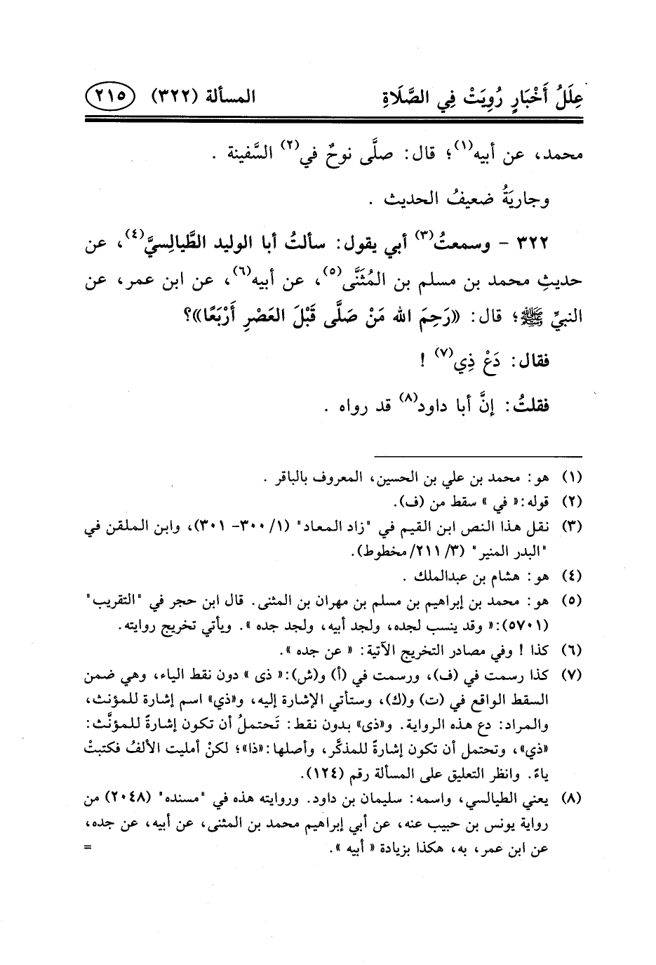٣٢٢ - وسمعتُ (٣) أَبِي يَقُولُ: سألتُ أَبَا الْوَلِيدِ الطَّيالِسيَّ (٤) ، عَنْ حديثِ مُحَمَّدِ بْنِ مُسْلِمِ بْنِ المُثَنَّى (٥) ، عَنْ أَبِيهِ (٦) ، عَنِ ابْنِ عُمَرَ، عن النبيِّ (ص) ؛ قَالَ: رَحِمَ اللَّه مَنْ صَلَّى قَبْلَ العَصْرِ أَرْبَعًا؟