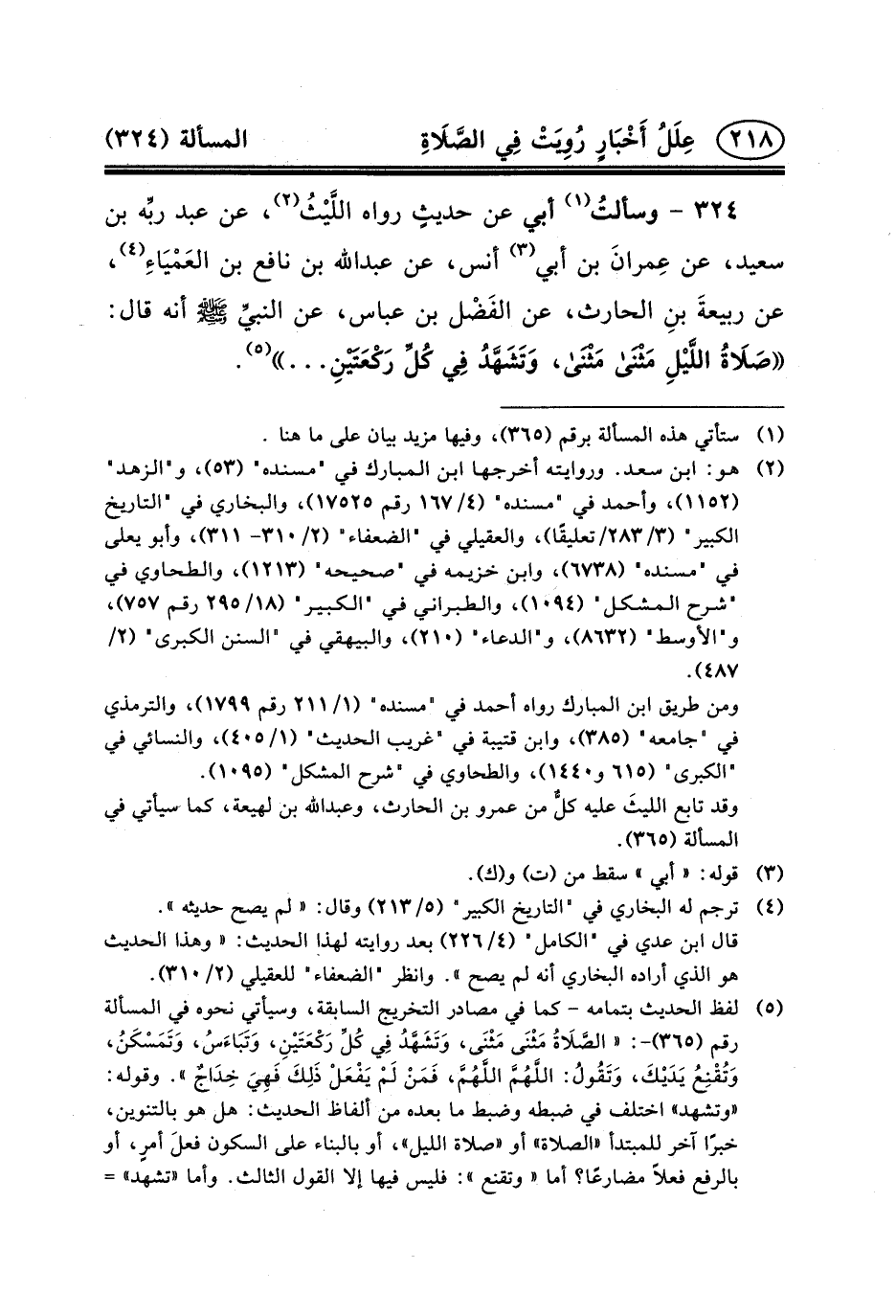 عَنْ عَبْدِ ربِّه بْنِ سعيد، عن عِمرانَ ابن أبي (٤) أنس، عن عبد الله بْنِ نَافعِ بْنِ العَمْيَاءِ (٥) ، عَنْ ربيعةَ بنِ الْحَارِثِ، عَنِ الفَضْل بن عباس، عن النبيِّ (ص) أَنَّهُ قَالَ: صَلَاةُ اللَّيْلِ مَثْنَى مَثْنَى، وَتَشَهَّدُ فِي كُلِّ رَكْعَتَيْنِ ... (٦) .