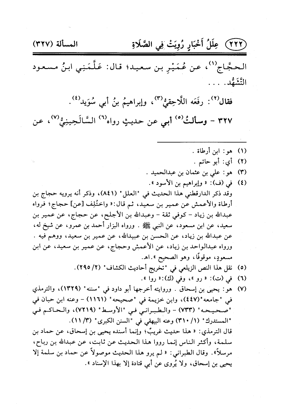 ٣٢٧ - وسألتُ (٥) أَبِي عَنْ حديثٍ رواه (٦) السَّالَحِينِيُّ (٧) ، عن