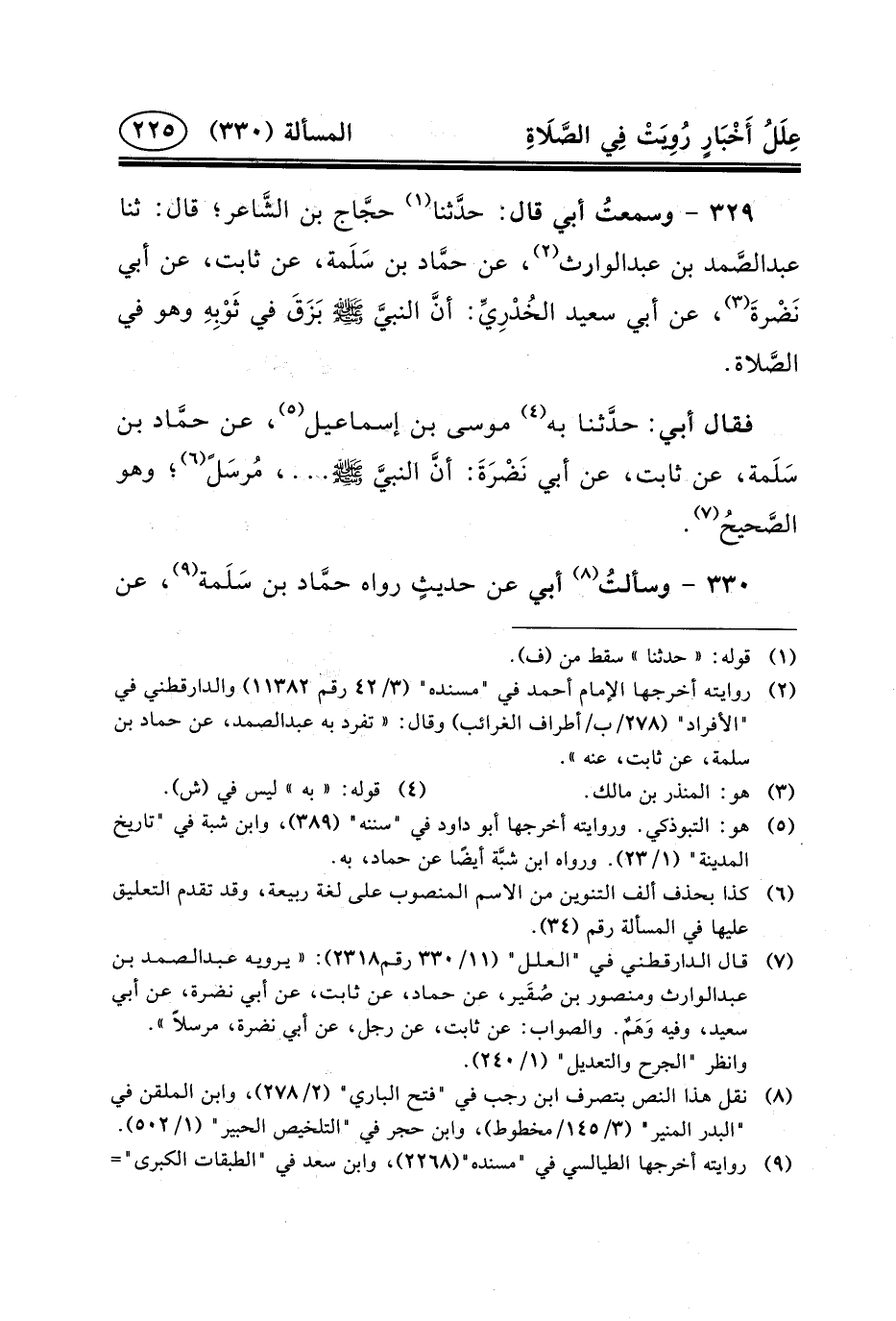 (٧) قال الدارقطني في "العلل" (١١/٣٣٠ رقم٢٣١٨) : «يرويه عبد الصمد بن عبد الوارث ومنصور بن صُقَير، عَنْ حَمَّادٍ، عَنْ ثَابِتٍ، عَنْ أَبِي نَضْرَةَ، عَنْ أَبِي سَعِيدٍ، وفيه وَهَمٌ. والصواب: عن ثابت، عن رجل، عن أبي نضرة، مرسلاً» .
